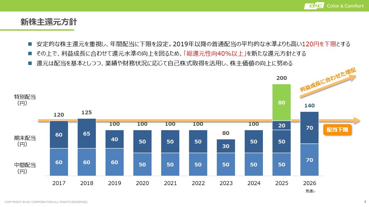 2025年度には120円の普通配当に加え、80円の特別配当を実施します。併せて2026年度以降は、総還元性向を40パーセント以上、配当下限を120円に設定します。