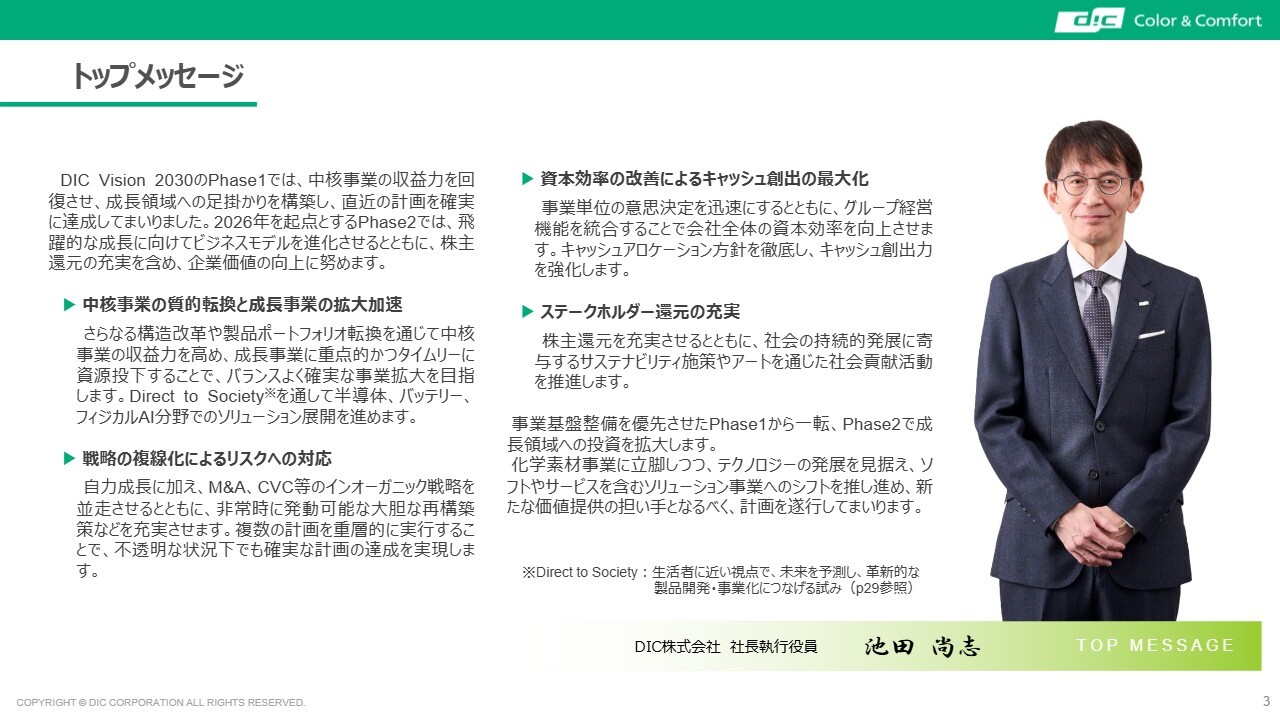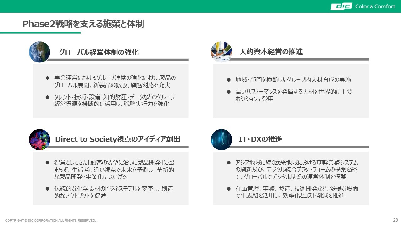 また、2026年度を起点とする2030年までの長期経営計画「DIC Vision 2030」のフェーズ2を始動させる予定です。こちらも後ほど内容をご紹介します。
