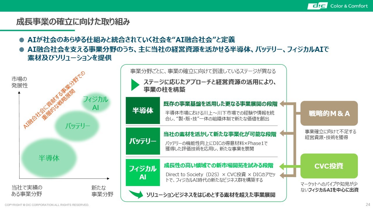 質問者:「DIC Vision 2030」のフェーズ2では、成長事業で2025年度実績の95億円から2030年度には170億円へと伸ばす計画となっています。分野として半導体・バッテリー・フィジカルAIと大きく分類できると思いますが、それぞれの分野がどの程度数値面で寄与するのかご説明をお願いします。