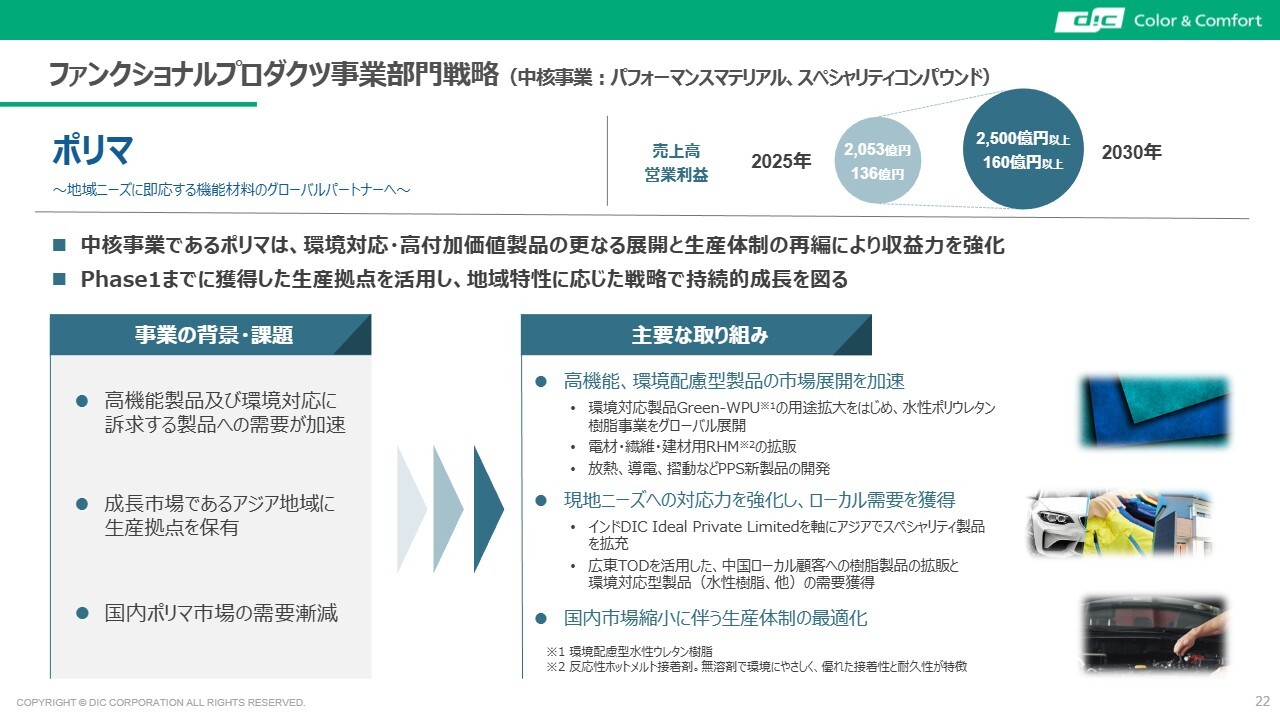 ファンクショナルプロダクツです。この中でも特に中核事業として位置付けているポリマは、環境対応や高付加価値製品を多彩に取りそろえています。