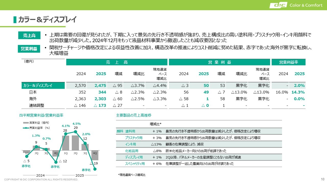 カラー&ディスプレイでは前年度から売上高が減少していますが、営業利益では構造改革が着実に実行されたことで海外が黒字に転換し、大きくプラスに転じています。