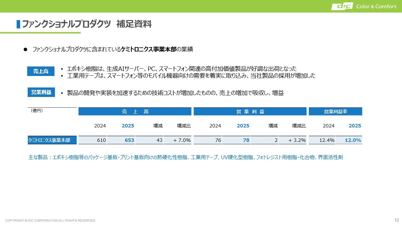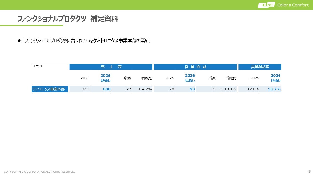 ファンクショナルプロダクツに含まれるケミトロニクス事業本部の業績は、増収増益ではあるものの、営業利益率はまだ本来目指すべき水準には達していません。そのため、2026年度以降、さらに利益率を向上させる対策を講じていきます。