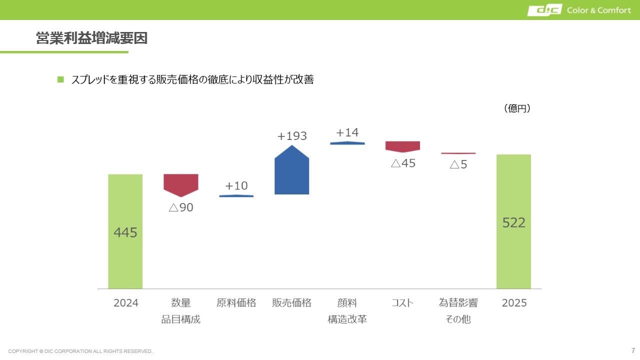 日本での売上高が19億円減少しており、これは国内で建築内装材事業を行っていた当社子会社DICデコールを昨年4月に事業売却したことが44億円の減収要因となっています。しかしこの要因を除けば、グループ全体では2024年度並みの売上高といえます。