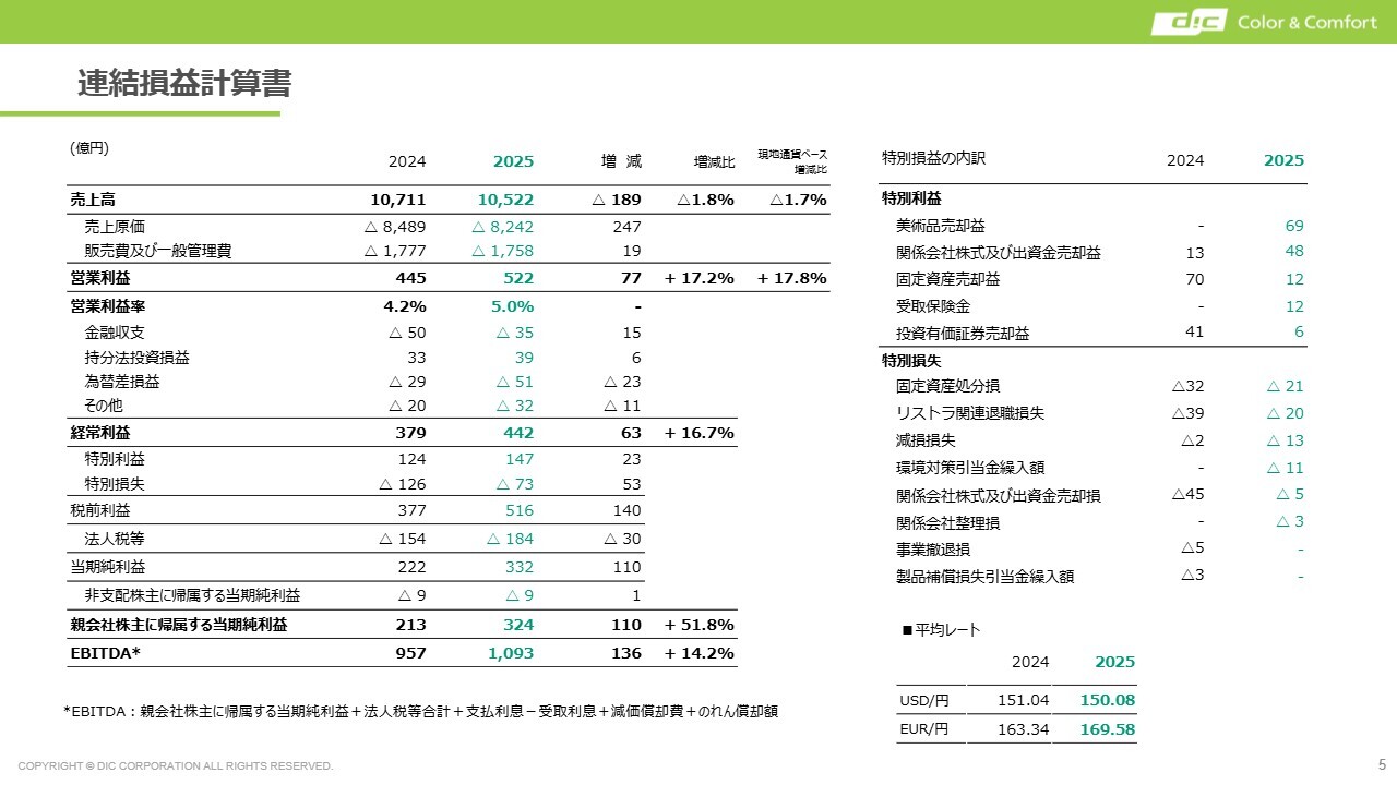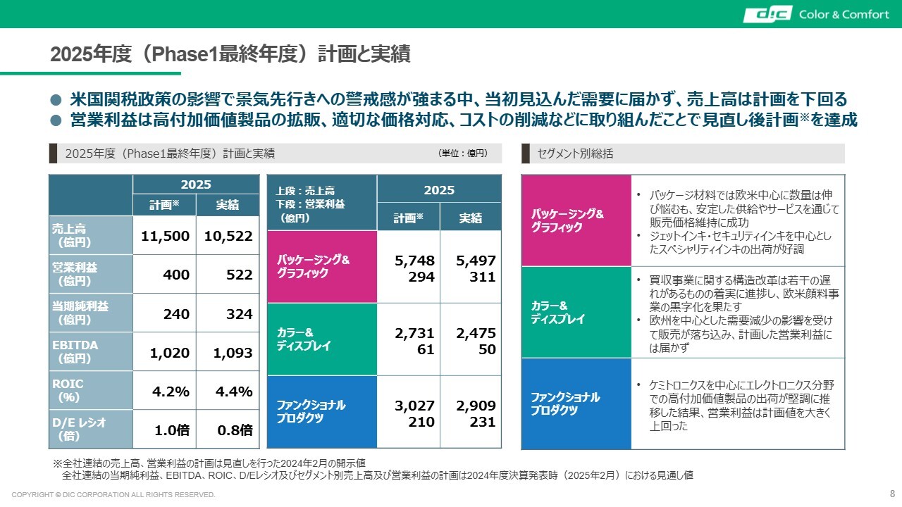 2025年度の実績は売上高が1兆522億円となりました。パッケージ用インキ、塗料用顔料、プラスチック用顔料といった主に消費財に近いボリュームゾーンの製品出荷数量が減少した影響を受け、前年度比で減収となりました。