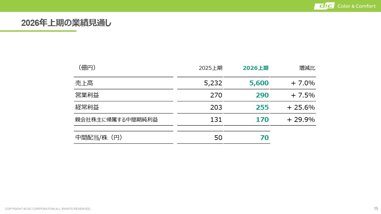 2026年度上期の業績です。ご覧のとおり、売上高、営業利益、経常利益、親会社株主に帰属する中間純利益のすべてが前年同期比で増加しています。中間配当は1株当たり70円を予定しています。