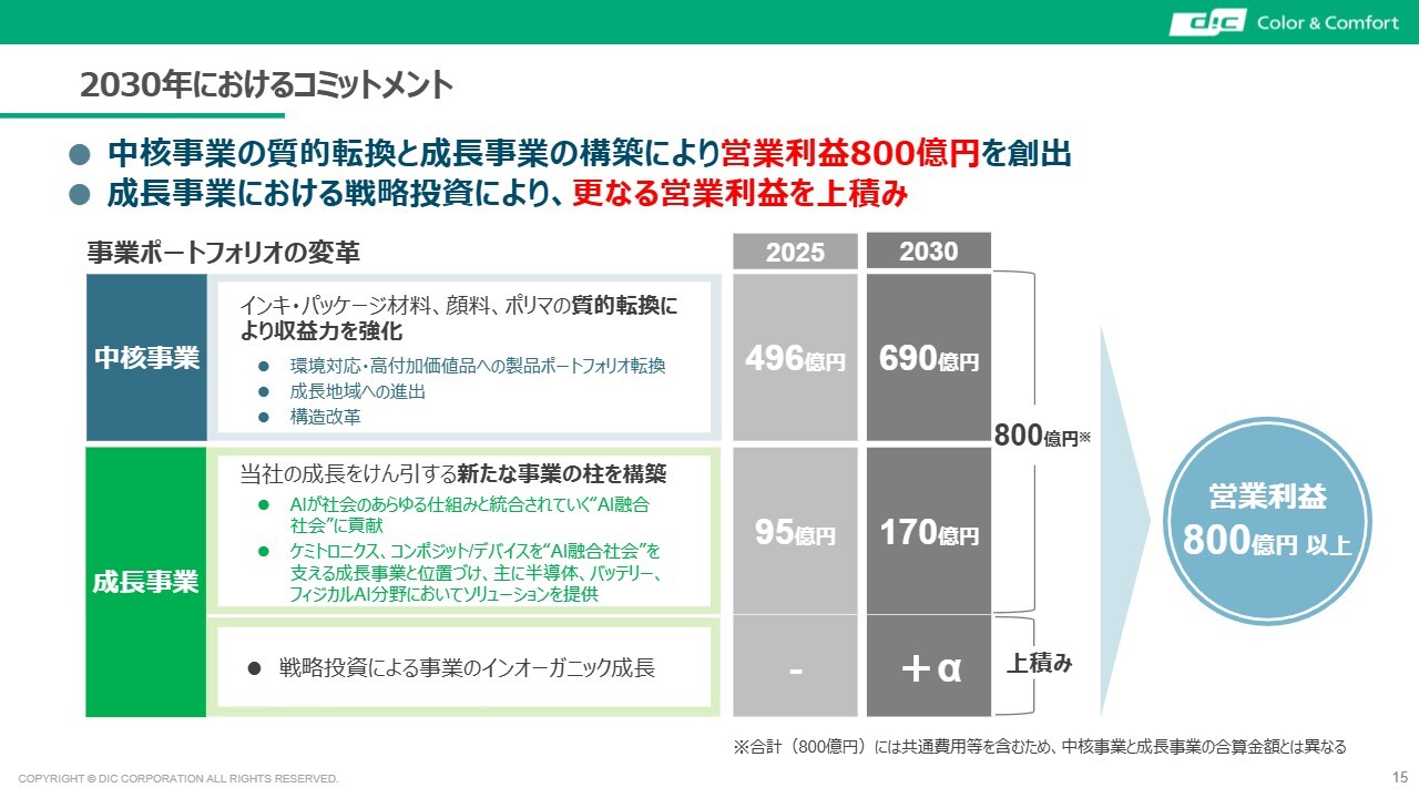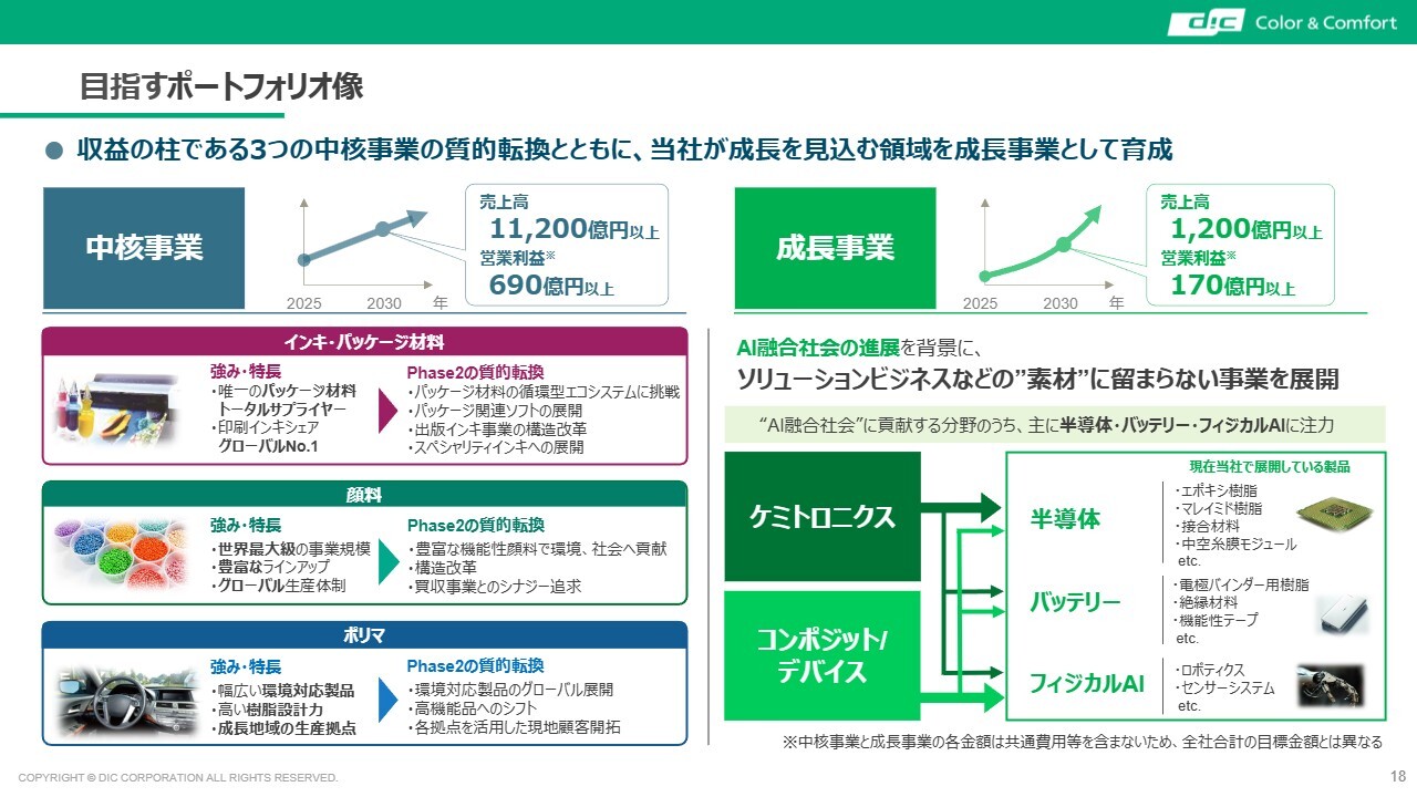 この2つの事業をうまく組み合わせて成長を目指すことが当社の基本方針です。「DIC Vision 2030」ではフェーズ1で主に中核事業の基盤をしっかり固め、フェーズ2においては、これを土台に成長事業で大きな飛躍を図る方針です。