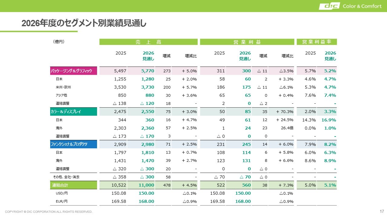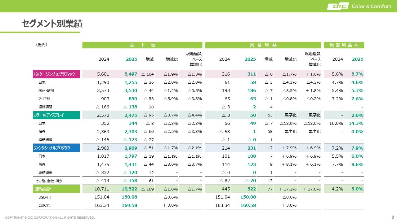 パッケージング&グラフィックは2024年度から若干下がっていますが、カラー&ディスプレイではプラスに転じています。また、ファンクショナルプロダクツは2024年度の7.0パーセントから2025年度には7.9パーセントとなりました。