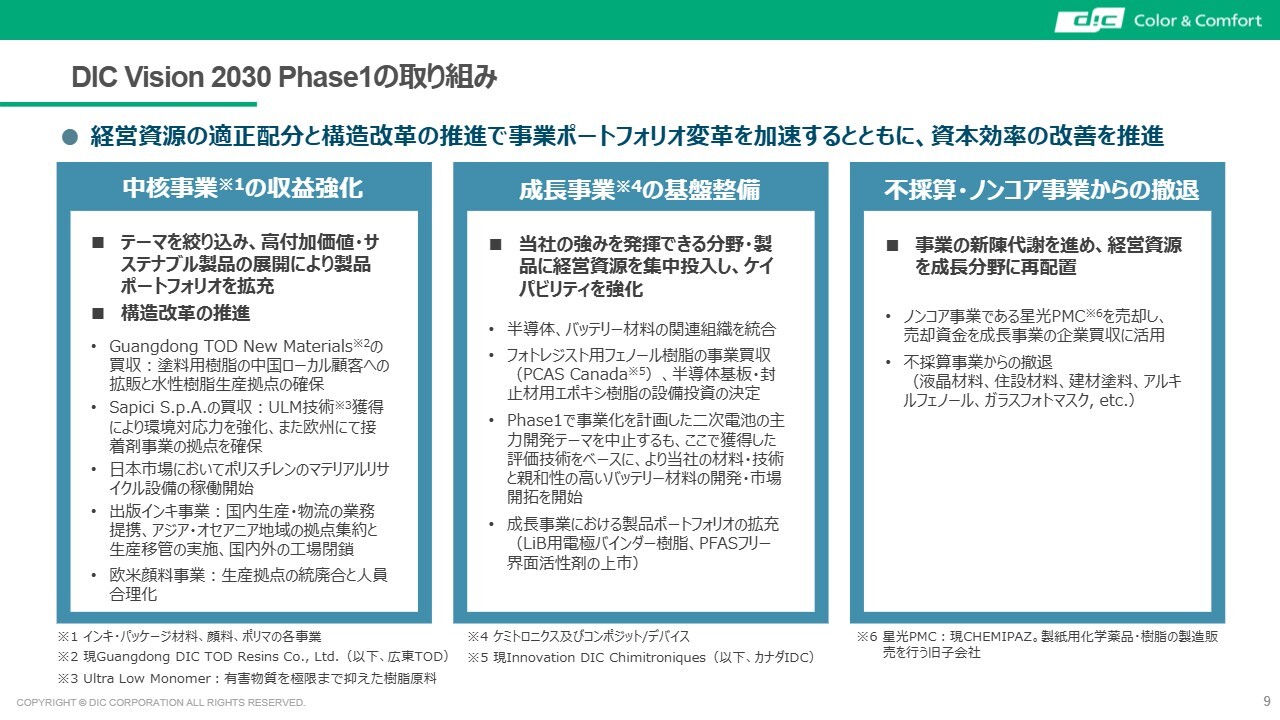 まず「DIC Vision 2030」全体の考え方をお話しします。2022年度から2025年度までのフェーズ1では、事業構成の中でも特に基盤部分の見直しを図ることで収益力をしっかりと確立させ、その収益力を基にフェーズ2で成長を実現する方針としています。