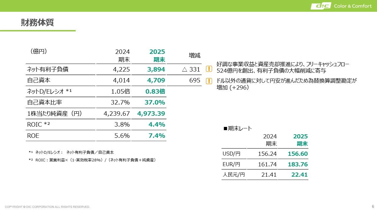 スライドには記載のない主要通貨も、おおむね円安が進行し、これにより先ほどの為替換算調整勘定にプラスの影響を与えました。その結果、ネットD/Eレシオは2024年度の1.05倍から2025年度には0.83倍へと大きく改善し、自己資本比率も37.0パーセントまで上昇しています。