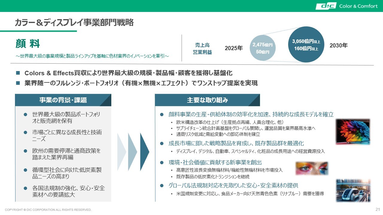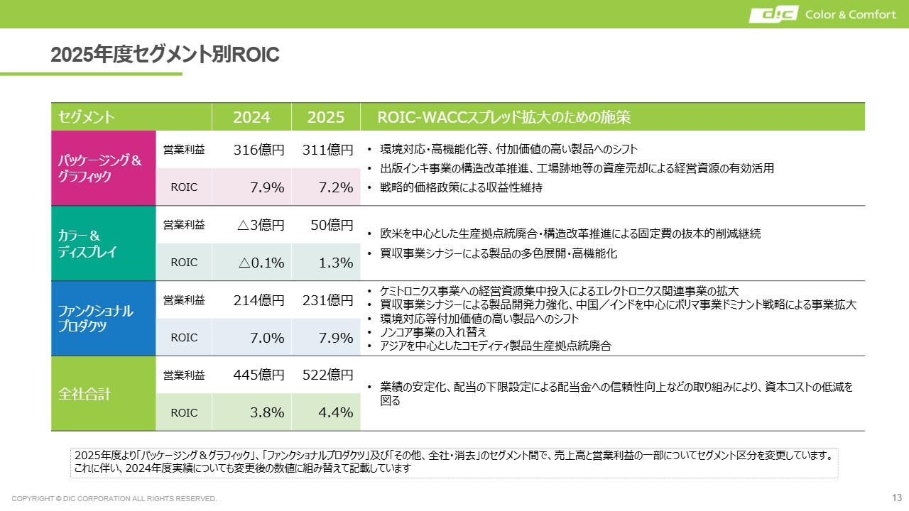 顔料を主力とするカラー&ディスプレイです。このセグメントでは構造改革が着実に進んでいますが、先ほど決算説明でもお伝えしたとおり、例えばROICといった指標で見た場合に、単体事業としての収益力が必ずしも満足できるレベルには達していないことは十分に認識しています。