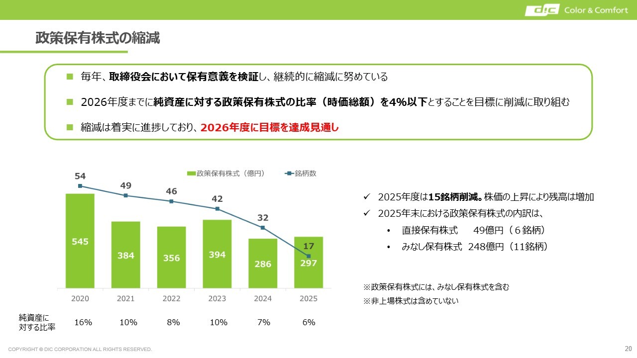 純資産に対する政策保有比率を、2026年度中に4パーセント以下まで引き下げることを目標に掲げています。スライドのグラフにも示したように、2025年度末時点で政策保有銘柄数は17銘柄まで削減しています。