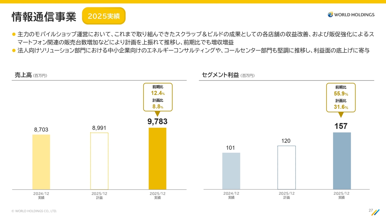 セグメント利益は2024年12月期から5億9,800万円増の22億9,300万円となり、前期比35.3パーセント増、計画比48.8パーセント増で着地しました。