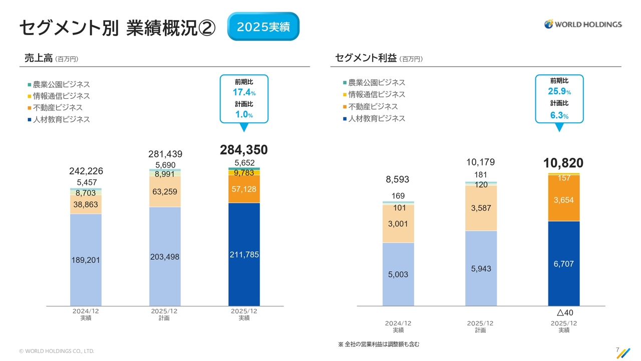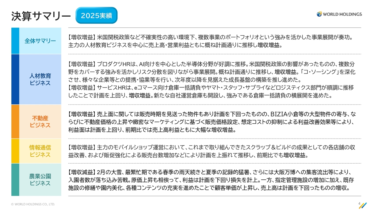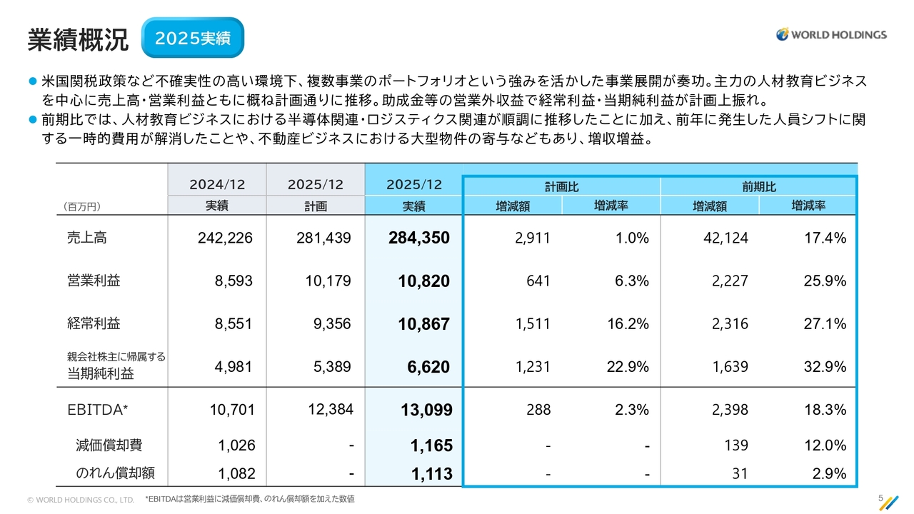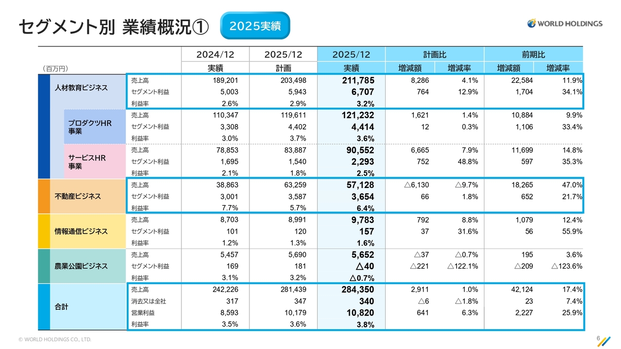 2025年度12月期の決算についてご説明します。全体的な概要については私から、人材教育ビジネスについては栗山から、また、不動産セグメントについては桑原よりご説明します。