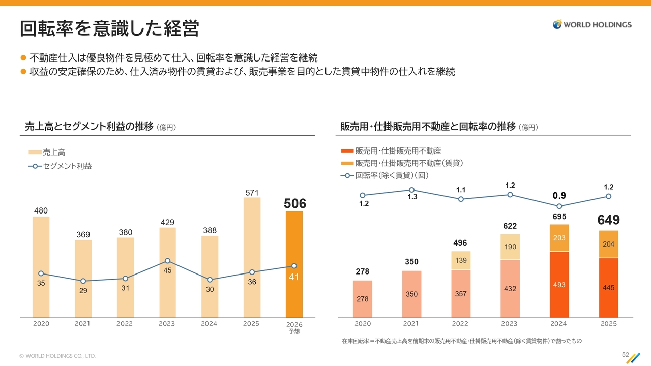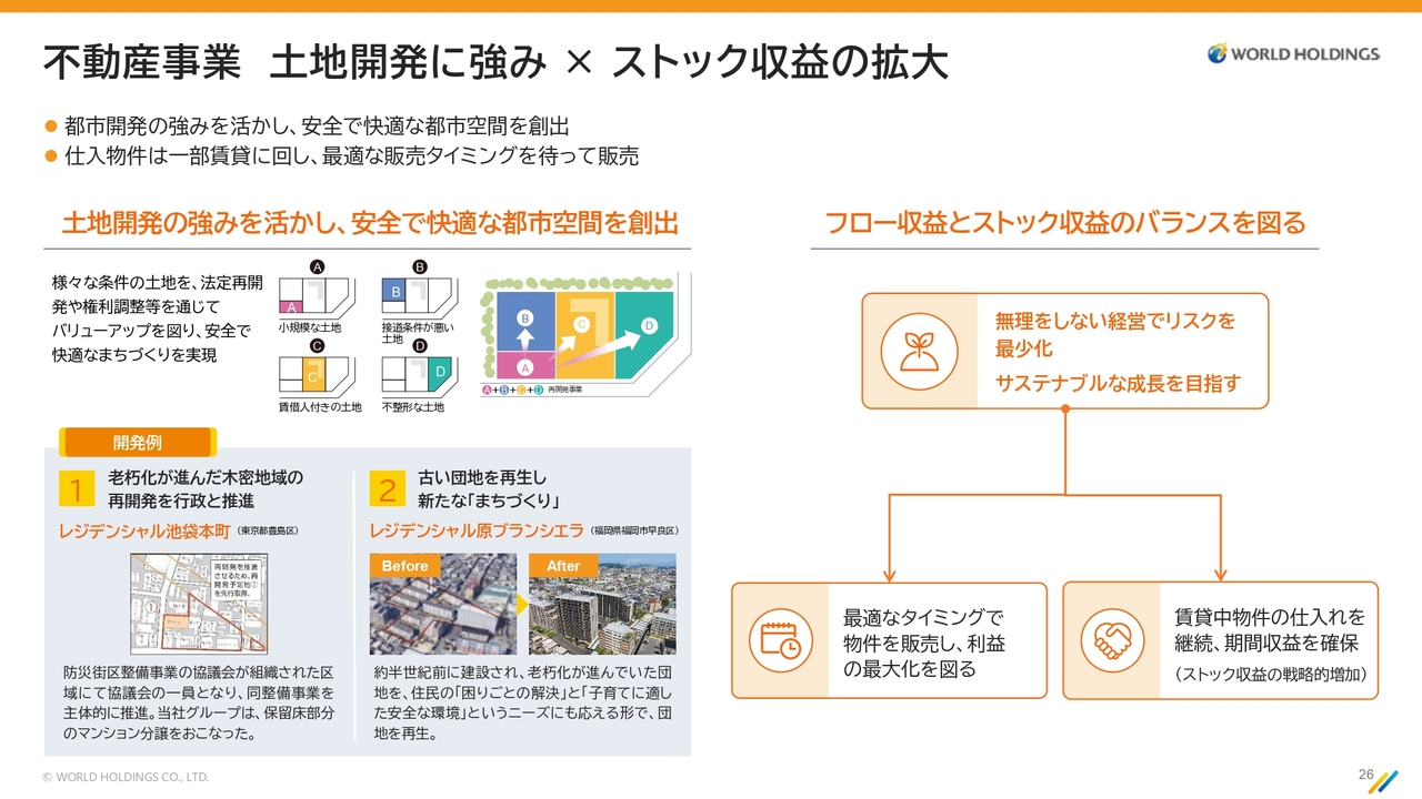 このように、長期、中期、短期の案件を組み合わせ、一定の回転率を維持しながら事業を進めていきます。同時に、ストック型の安定収益である賃貸収入も確保し、バランスの取れた事業運営を目指します。