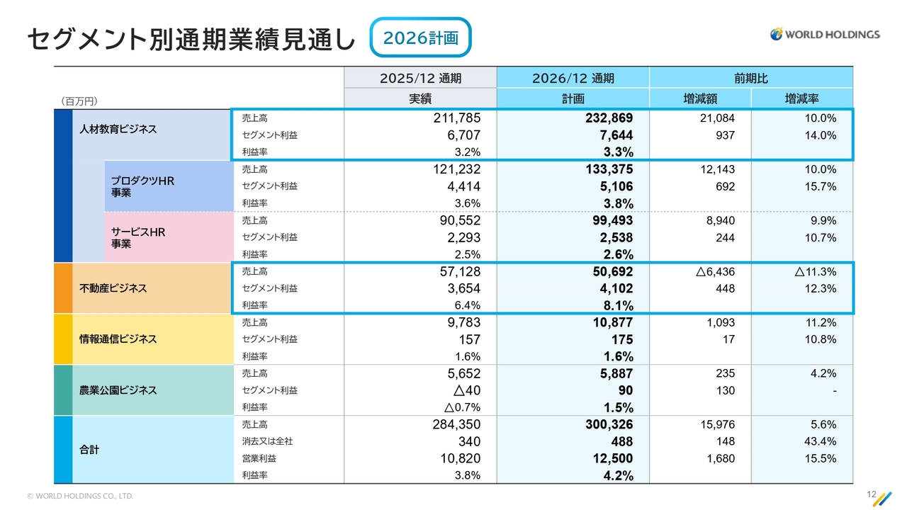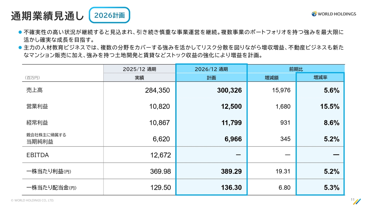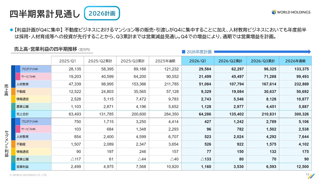 当社は第4四半期に数字が偏る傾向があります。今期の不動産ビジネスは引き渡しが第4四半期に多く、業績計画が第4四半期に偏重していますが、2026年も通期では増収増益が十分達成可能であると考えています。引き続き最善を尽くして取り組んでいきます。