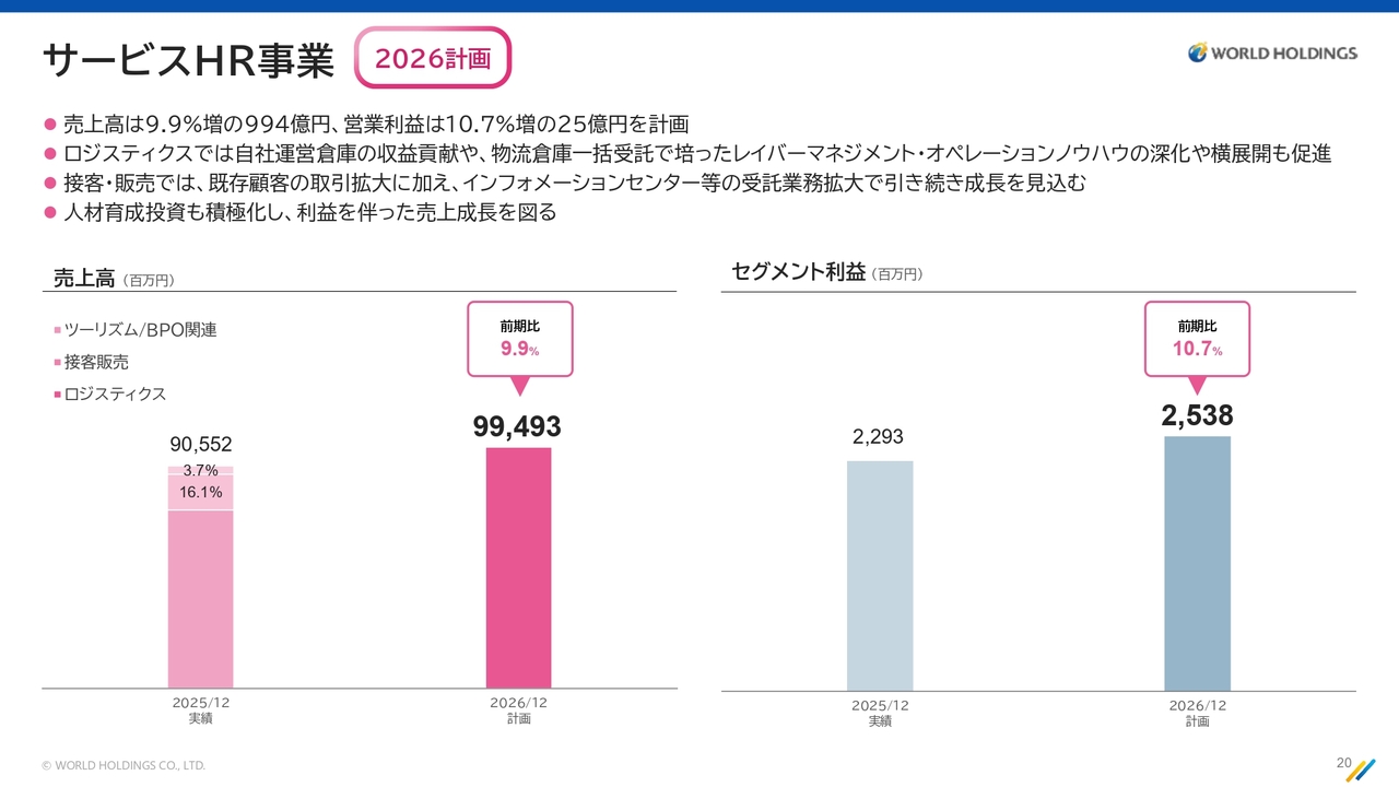 サービスHR事業の2026年の計画数値についてご説明します。売上高は前期比89億4,100万円増の994億9,300万円、9.9パーセント増という計画になっています。