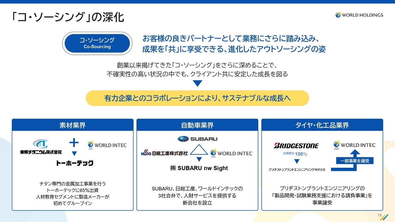 また、当社は創業以来アウトソーシングではなく「コ・ソーシング」を掲げています。この取り組みの準備やさまざまな事柄が、いよいよ現実味を伴って結果として表れてきました。その点については後ほどご説明したいと思います。