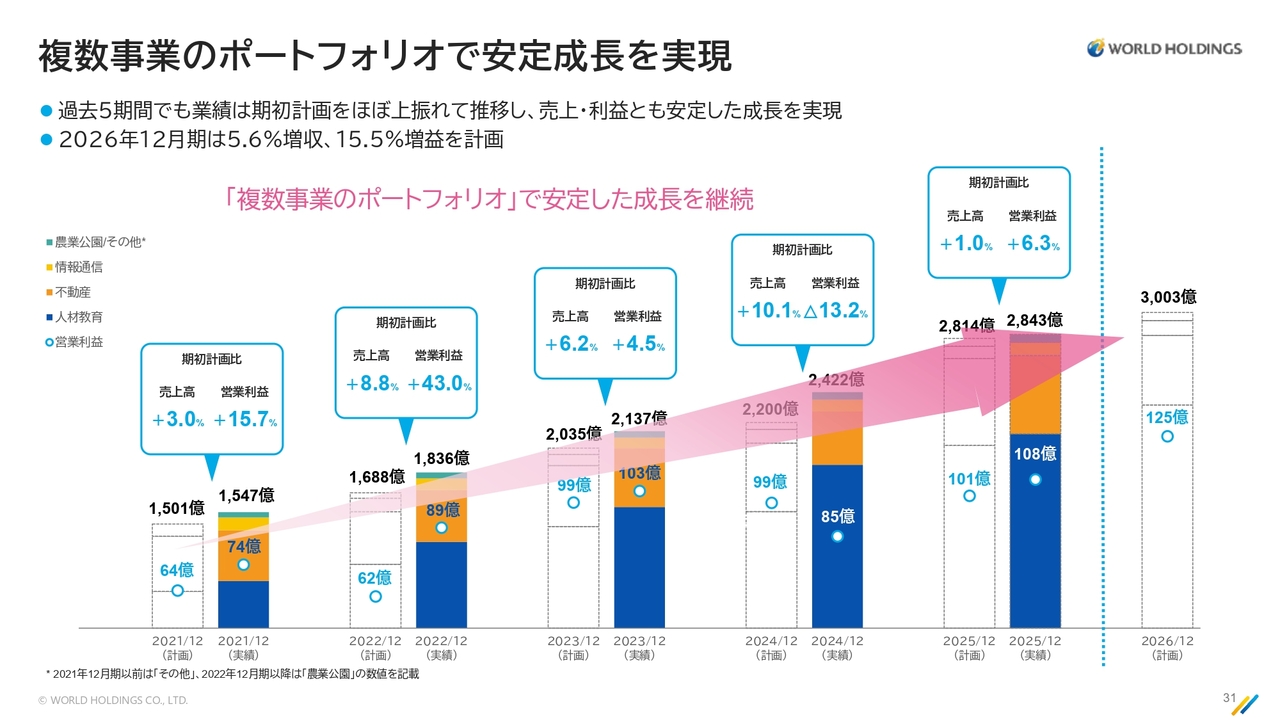 売上高は2,843億5,000万円、営業利益は108億2,000万円と、過去最高の業績を達成しました。すべての事業において、当社は絶えず時代の変化をはかりながら柔軟に対応しています。特に当社の人材教育ビジネスはさまざまな業種をカバーする中で、業種ごとの戦略を事前に想定しつつ、適切に手を打てることが当社の強みと考えています。この点は不動産事業も同様です。