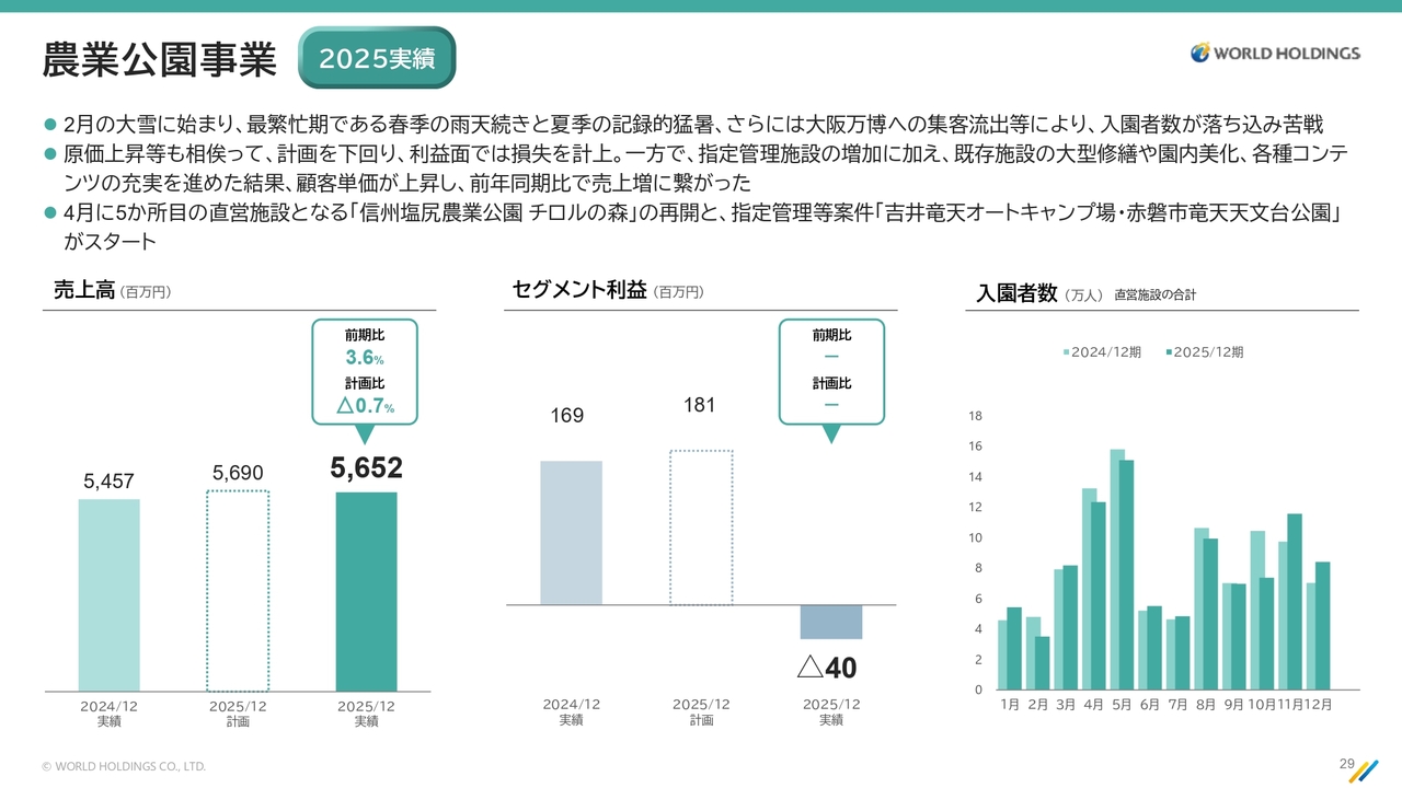 さらに、大阪万博による影響もあり、ディンプルは良い影響でしたが、逆に農業公園に関しては直接的な打撃を受けました。ただし、全体的には着実に伸びています。