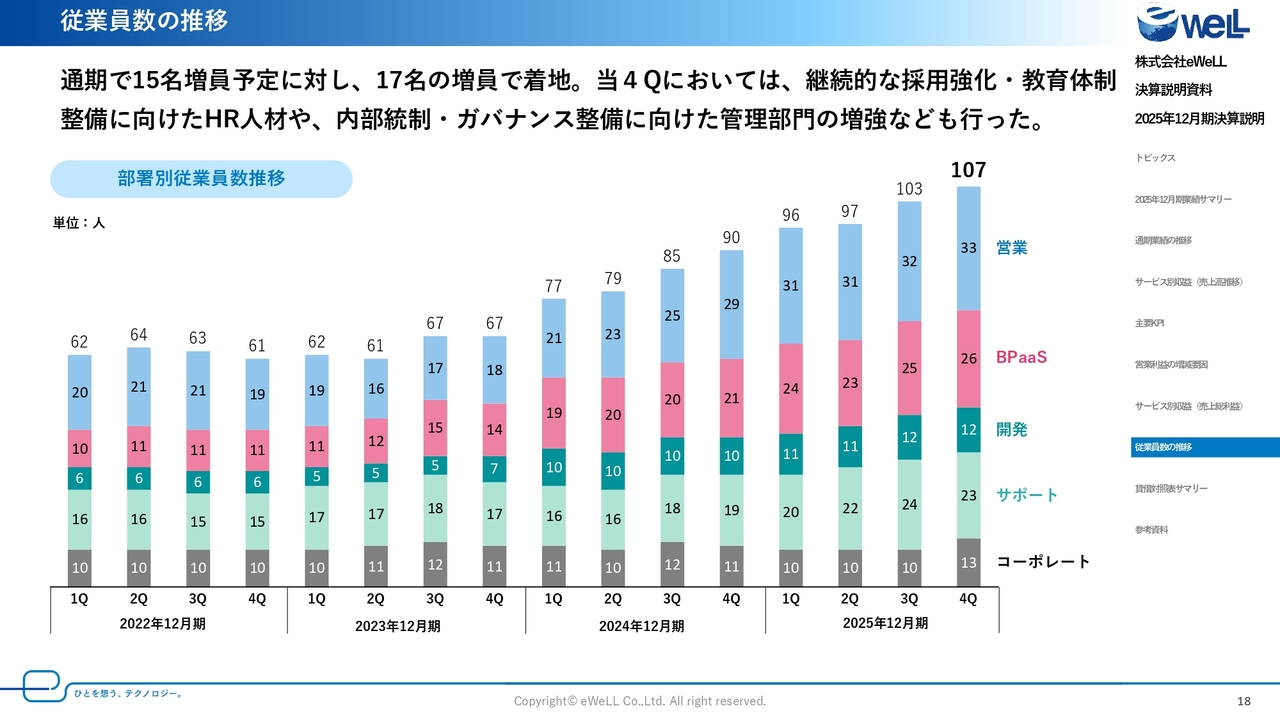 従業員数の推移は、通期で17名の増員となりました。コーポレート部門は、内部体制の強化を行うため、事業規模に応じた体制を取っていく方針で積極的に採用を行いました。HR人材育成による中期計画の実現に向けた活動や内部統制・ガバナンスレベルの強化を目指します。