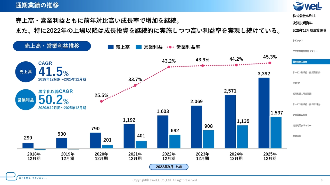 営業利益率としては45.3パーセントを実現し、売上成長も非常にチャレンジングな目標を立てていましたが、今回の決算でもそれを着実にクリアしました。