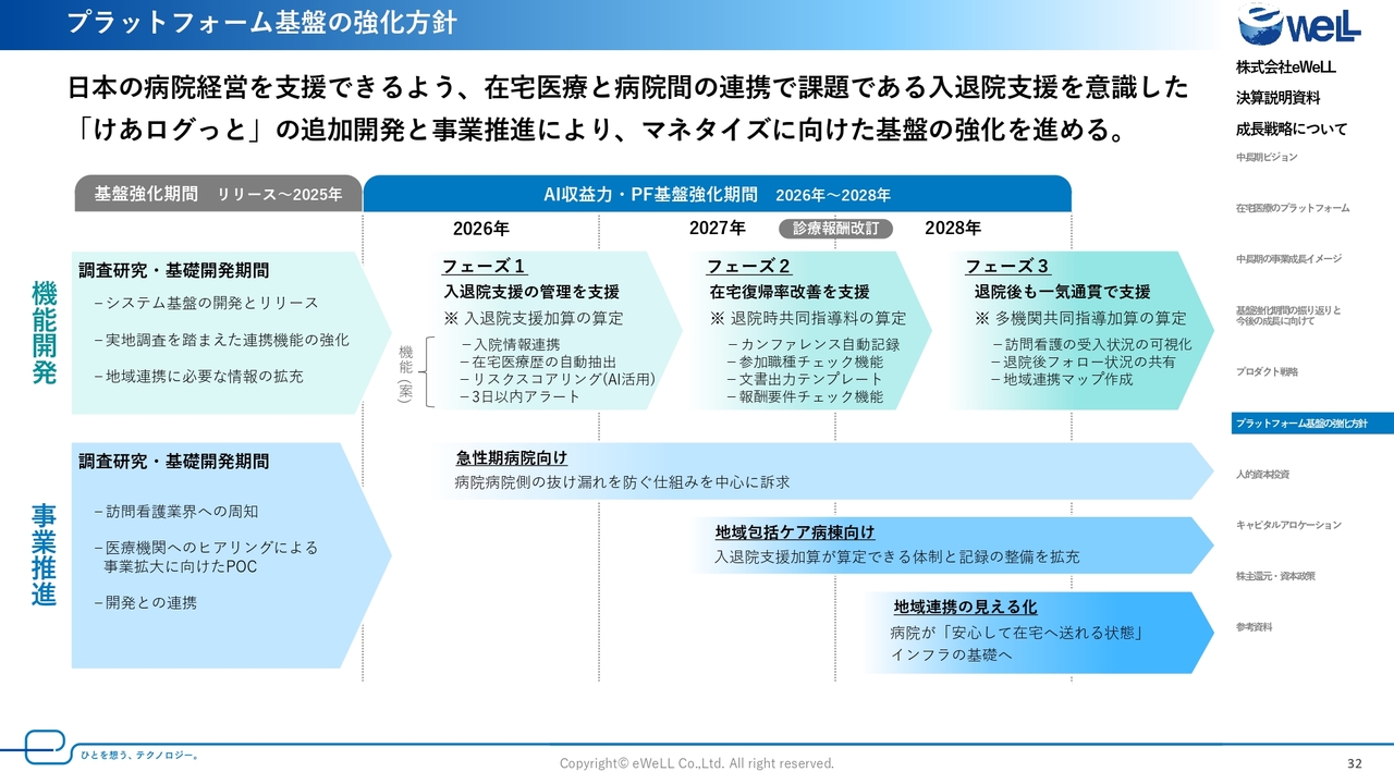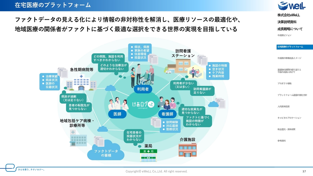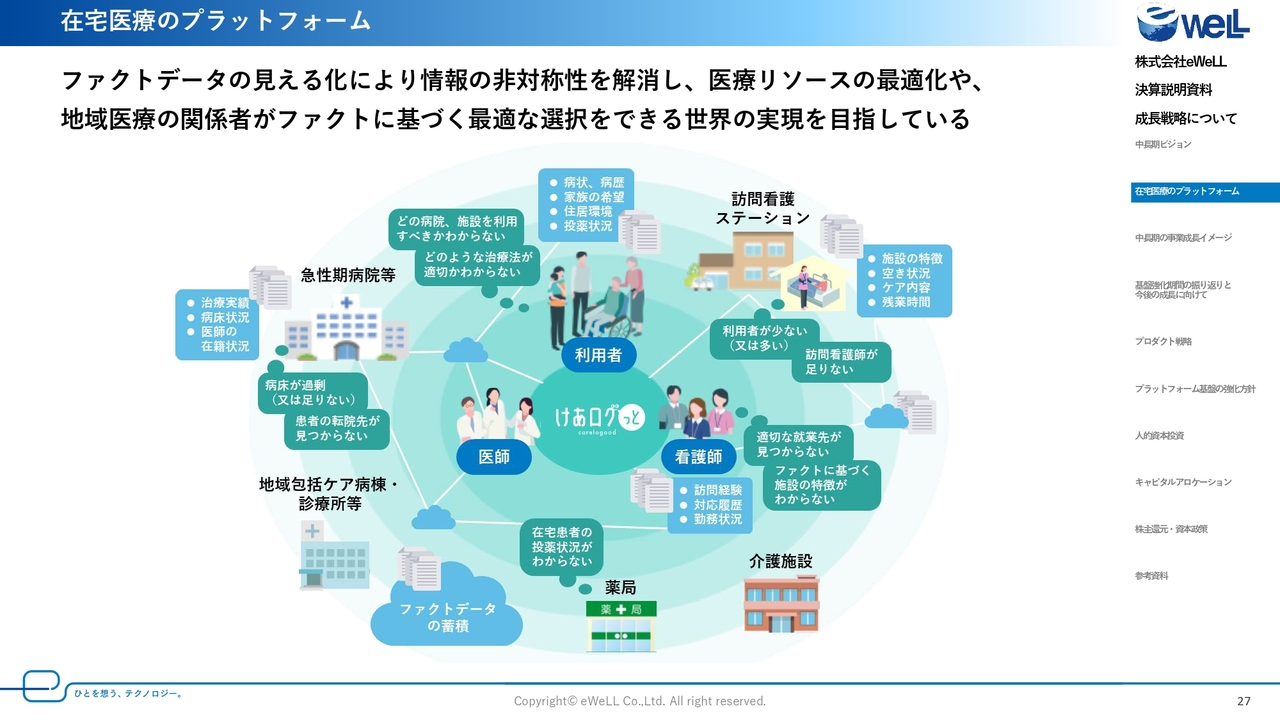 また、中期計画の中では、今後ますます国策化されていく医療DX推進のため、新たなAIサービスの開発によるアップセル商材の強化や、「けあログっと」をはじめとする在宅医療のプラットフォーマーとしての進化に向けた活動を本格化していきます。