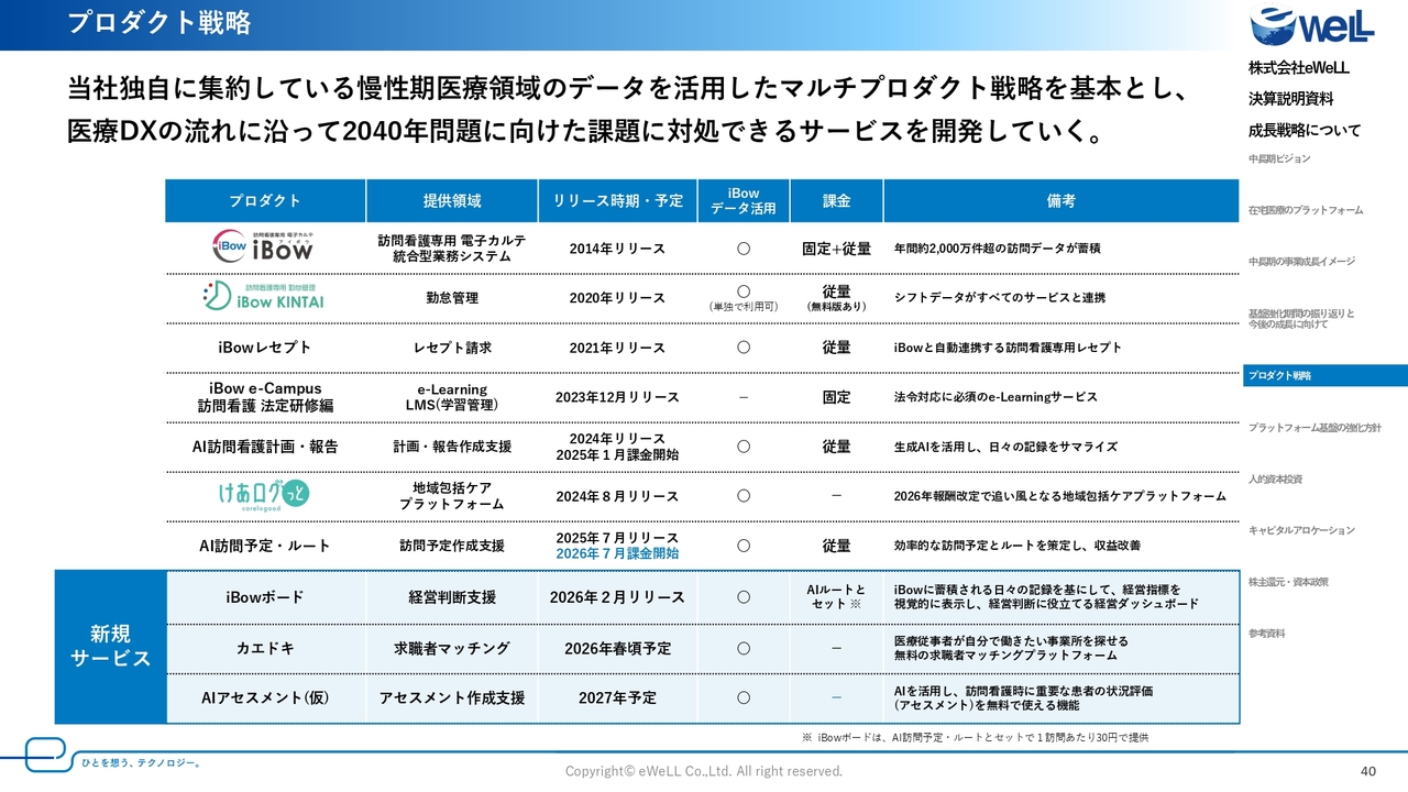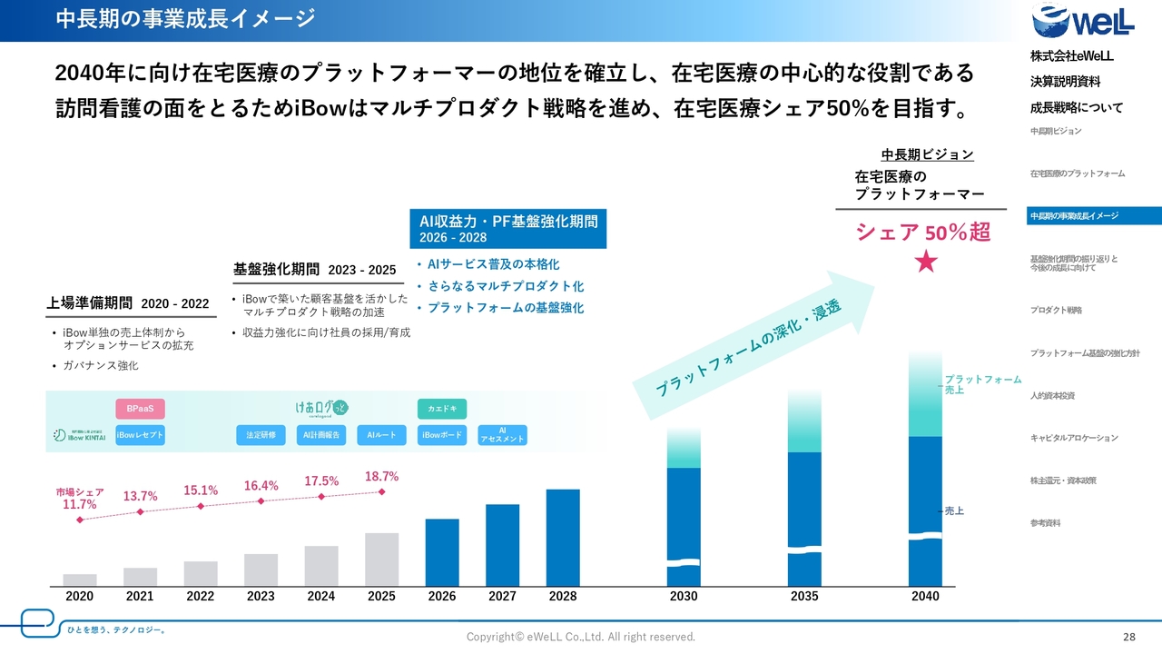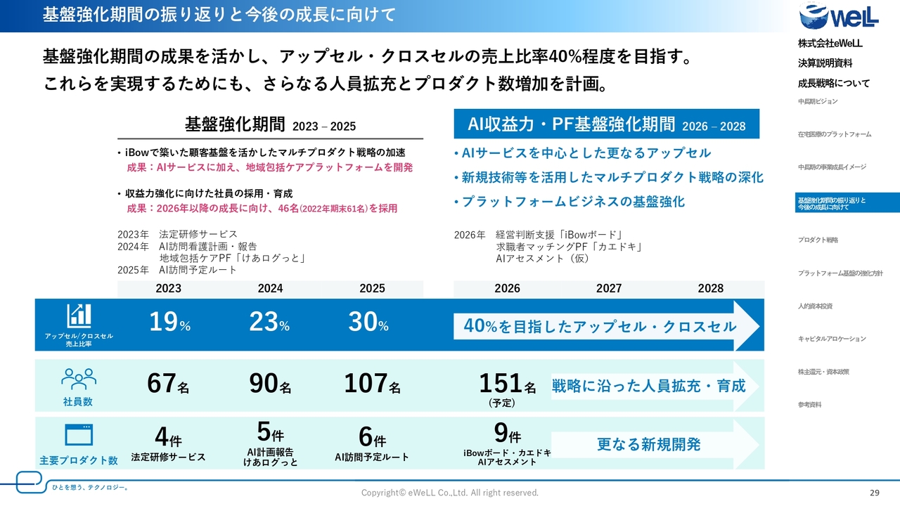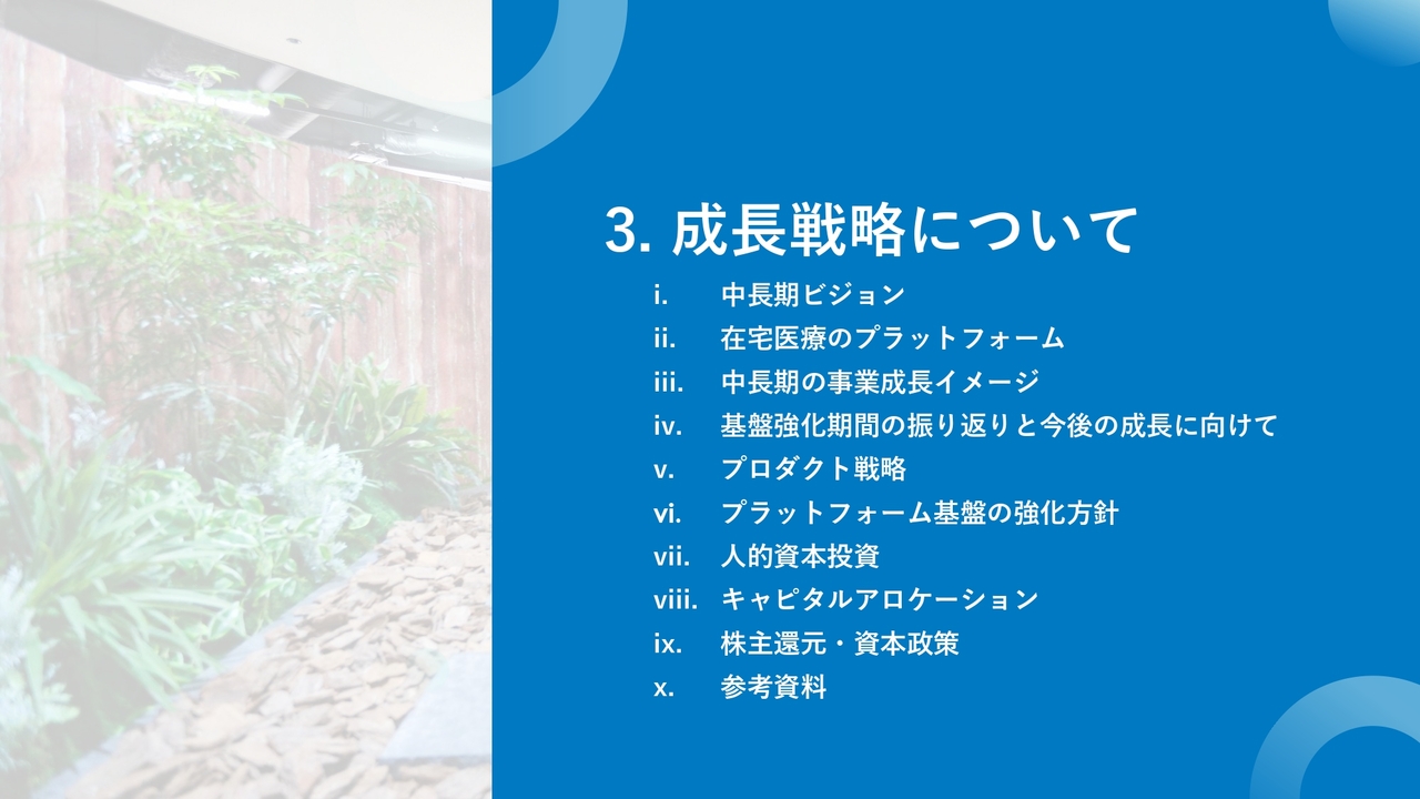 また、中期計画の中では、今後ますます国策化されていく医療DX推進のため、新たなAIサービスの開発によるアップセル商材の強化や、「けあログっと」をはじめとする在宅医療のプラットフォーマーとしての進化に向けた活動を本格化していきます。