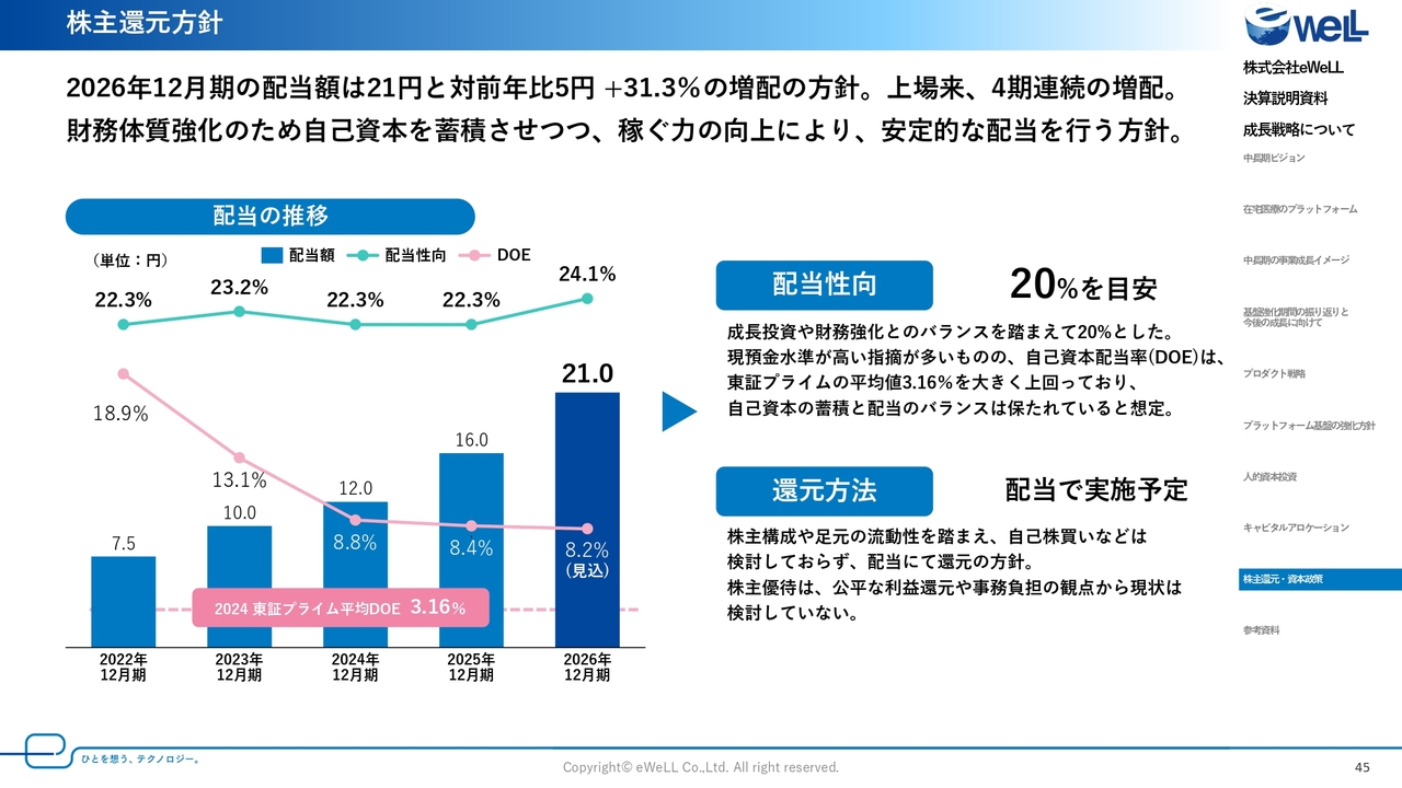 なお、自己資本配当率であるDOEもプライム市場の平均としても高い水準にあり、市場全体で見ても効率的な配当と成長性を両立できると考えています。