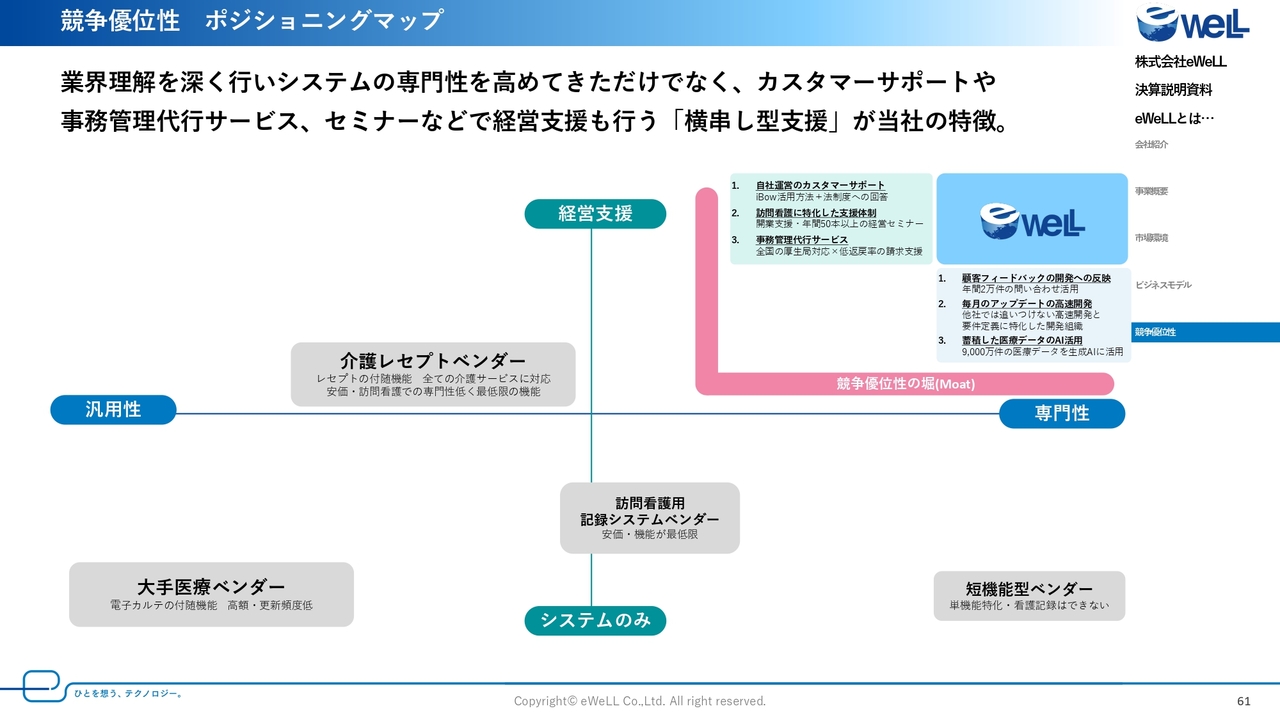 当社は、訪問看護領域に特化してサービス開発を行っています。競合他社は、数多くの介護サービスの対応や医療向けのサービスの一環として訪問看護の対応を行っており、業界理解や根本にある考え方、すでにある機能の充実度などが大きく異なります。