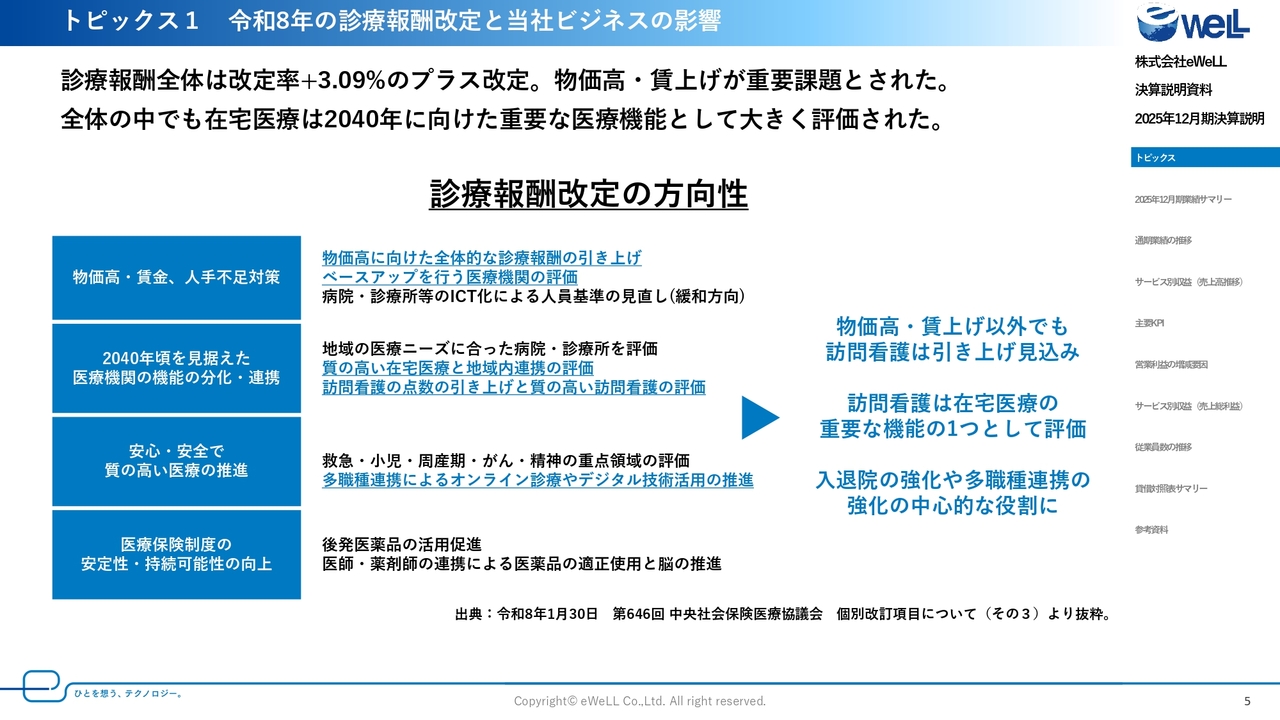 2026年には診療報酬の改定が予定されています。当社の事業は診療報酬改定の影響を直接的に受けるわけではありませんが、間接的に影響を受ける部分があるため、先月末に公表された診療報酬改定の全体の方向性からご説明します。