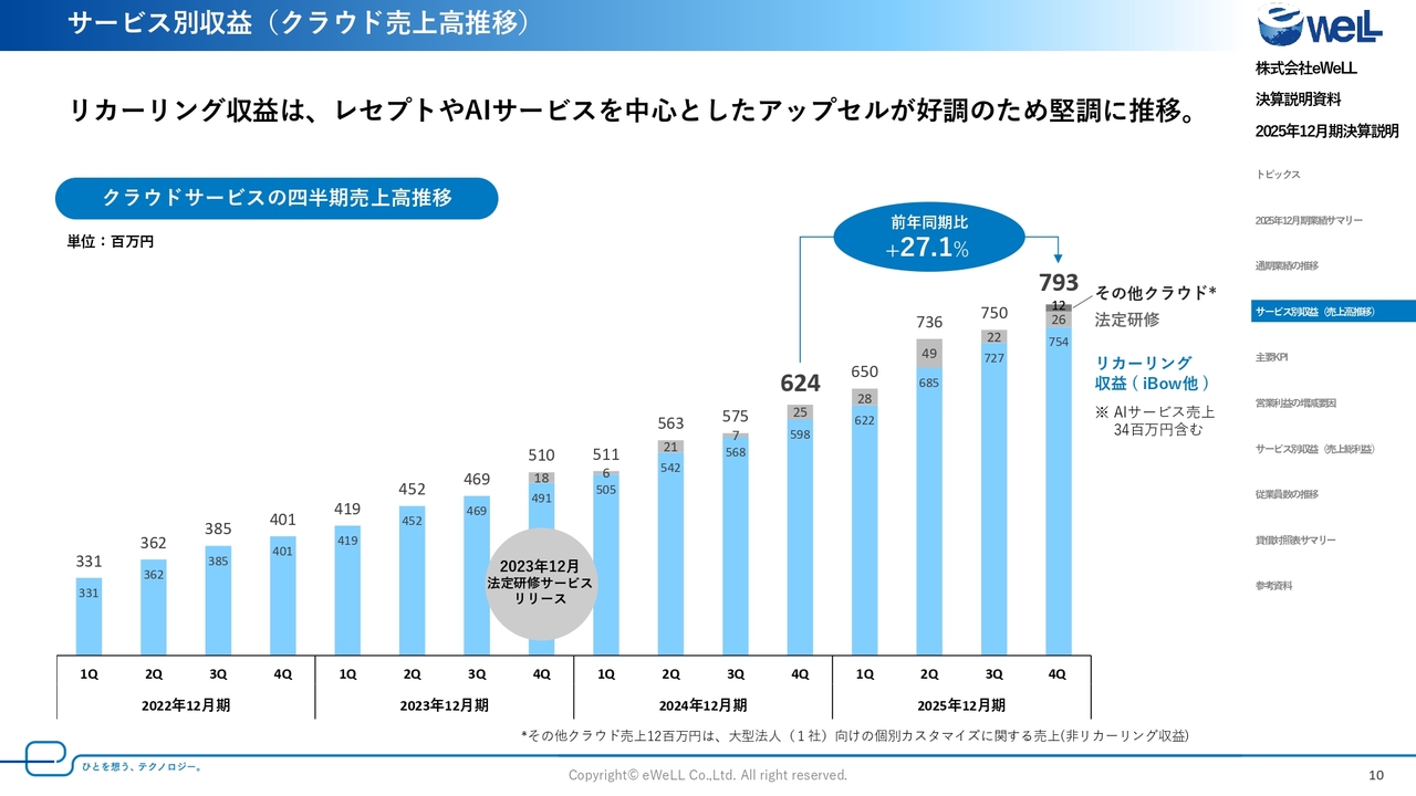 まず、クラウドサービスからご説明します。先ほどお話ししたとおり、AIなどを含むリカーリング収益が堅調に増加しました。前年比でプラス27.1パーセントの7億9,300万円となりました。
