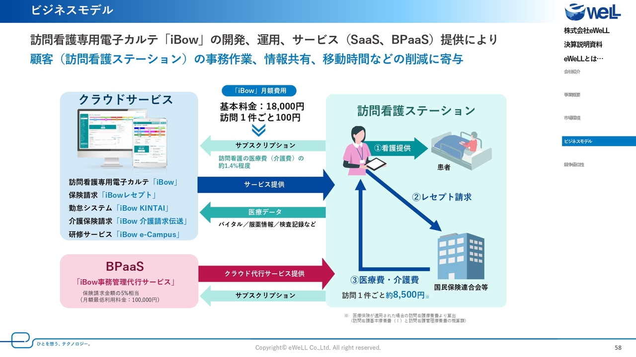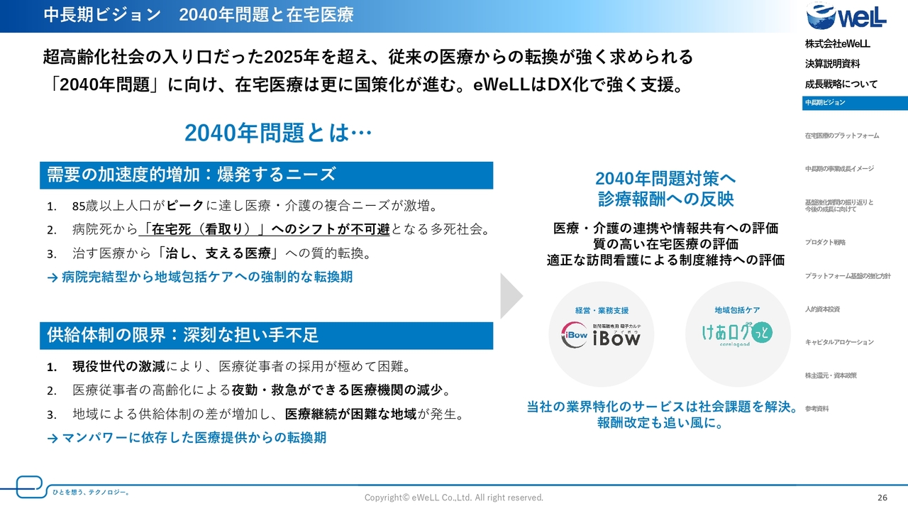 従来は、病院や診療所の医療提供が主体でしたが、2040年に向けて訪問看護や介護サービスなどさまざまなサービスで支えることが求められるようになっており、特に当社の主力サービスである「iBow」を活用する訪問看護ステーションの期待役割は、診療報酬改定ごとに年々大きくなっています。