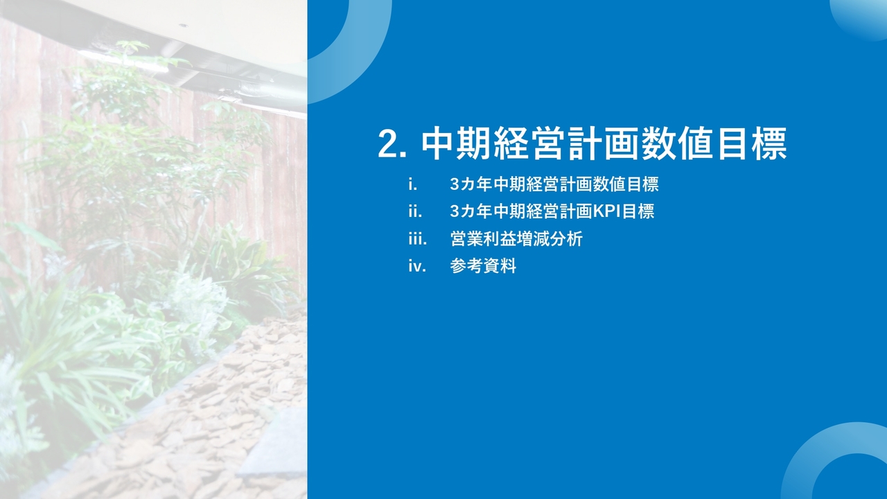 中期経営計画数値目標については、こちらの目次のとおりご説明します。