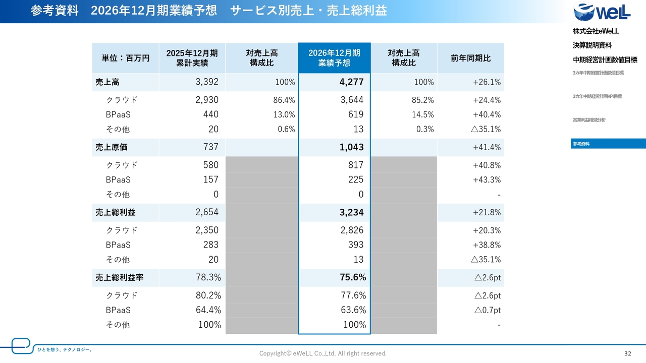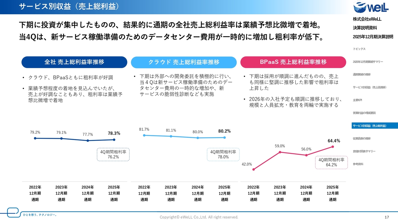 スライド左側の全社売上総利益率は、通期で78.3パーセントとなりました。クラウド売上総利益率は通期で80.2パーセントで、第4四半期単体で見ると78.0パーセントと低下しています。サービス数が増加しており、保守費用が増加したことや開発投資の継続による増加と2026年度の新サービスの準備のための一時的な費用が増加した影響になります。