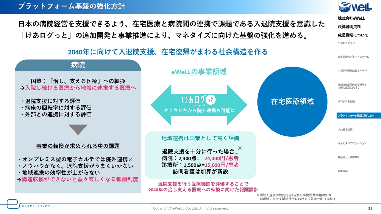 ただ日本の医療において、病院が赤字経営ということは、大きな問題となるため、当社としては地域包括ケアシステムの「けあログっと」を拡充し、病院から在宅のシームレスで人員リソースを削減した連携ができる仕組みを行い、2040年に向けた高齢者人口の増加と病院の収益性の改善に寄与したいと考えています。