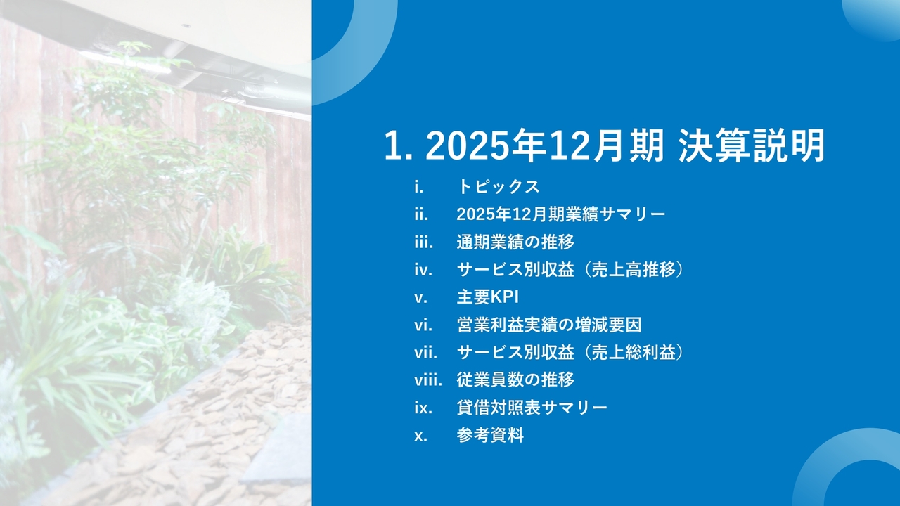 2025年12月期決算説明については、こちらの目次のとおりご説明します。
