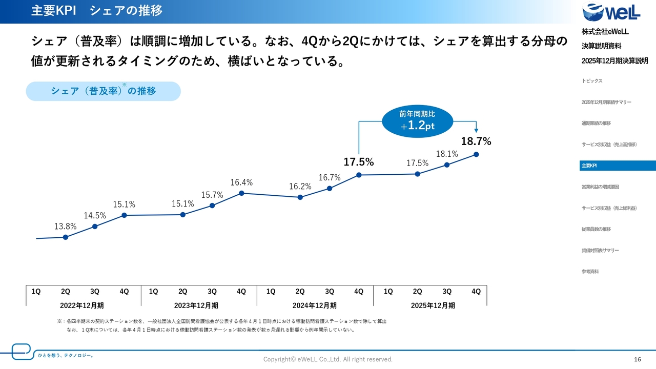 KPIについてのご説明の最後に、市場シェアについてご報告します。実績は前期比プラス1.2ポイントの18.7パーセントとなりました。シェアが約2割に迫ってきたことで、業界内での認知は定着し、ステージが確実に変わってきていると実感しています。