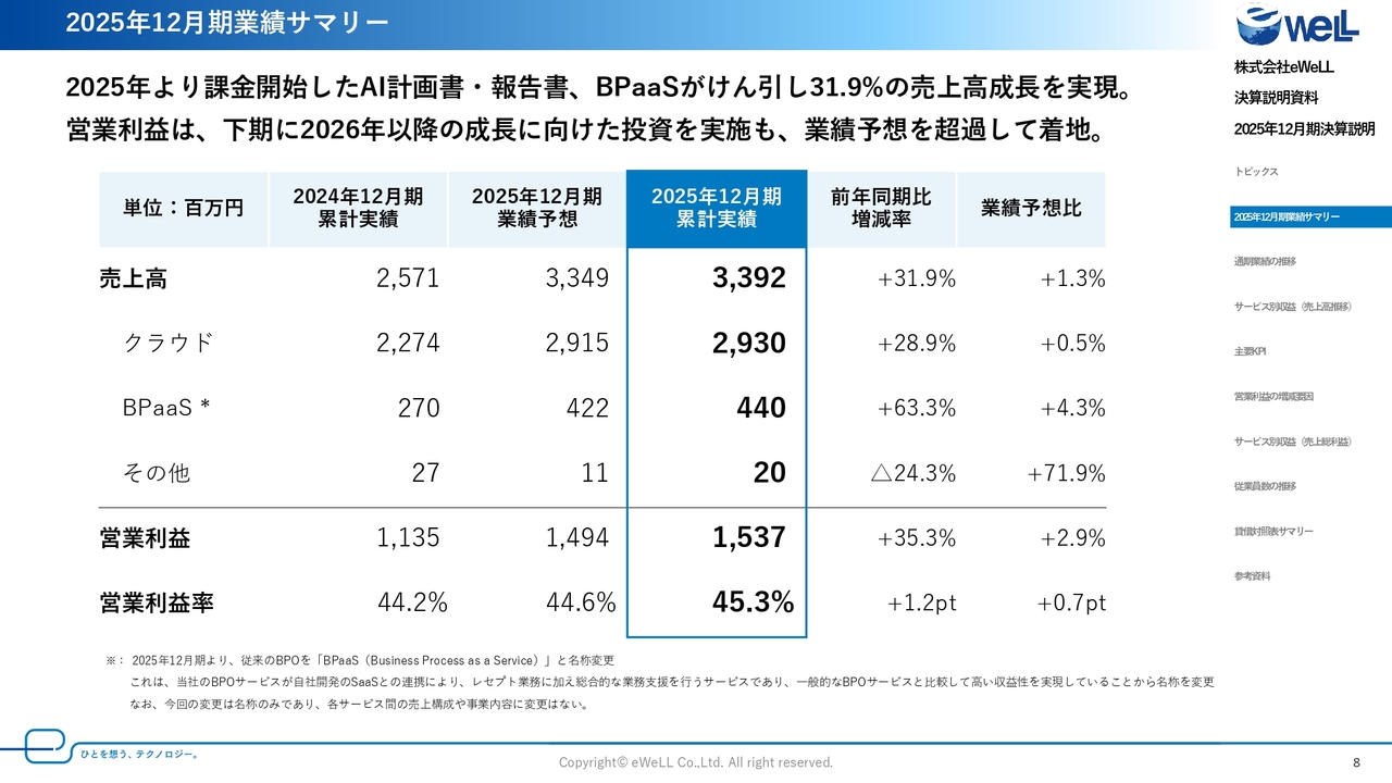 売上については、2025年12月期より課金を開始した「AI訪問看護計画・報告」機能やBPaaSが成長を牽引しました。