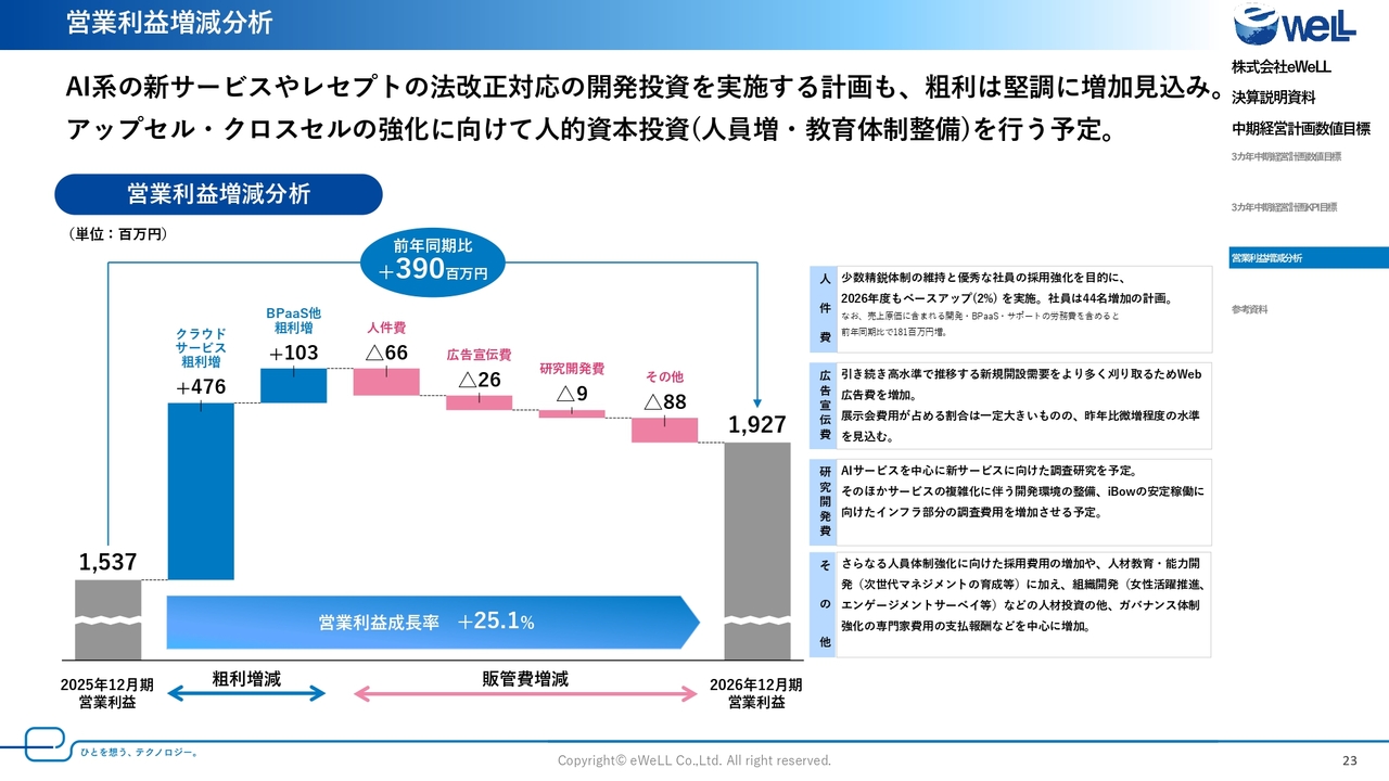 回答:人件費は人材採用の強化やベースアップの実施により確かに増加していますが、当社としては想定内であり、収益成長で吸収できています。実際に、2025年12月期は下期に人件費を含む先行投資を行いながらも、営業利益率45.3パーセントと高水準を維持して着地しています。