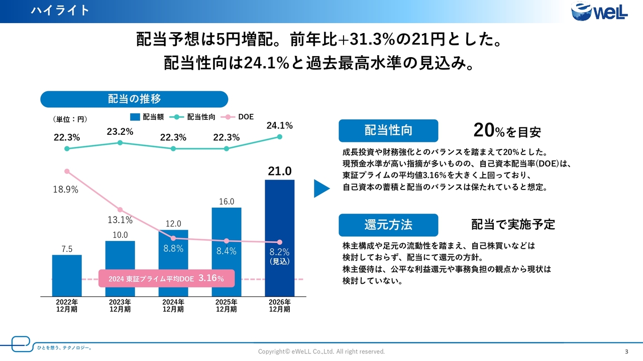 ハイライトです。2026年12月期の配当予想は、5円増配の21円としました。これは、2025年12月期配当の16円から31.3パーセントの増加となります。来期の業績に対する当社の自信と配当性向等の水準を踏まえて決定しました。