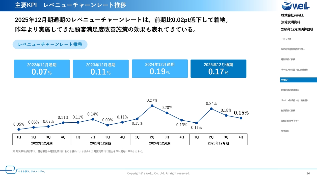 チャーンレートについても、前年に対して0.02ポイント引き下げることができ、顧客満足度を高める施策が徐々に実を結んでいるものと感じています。