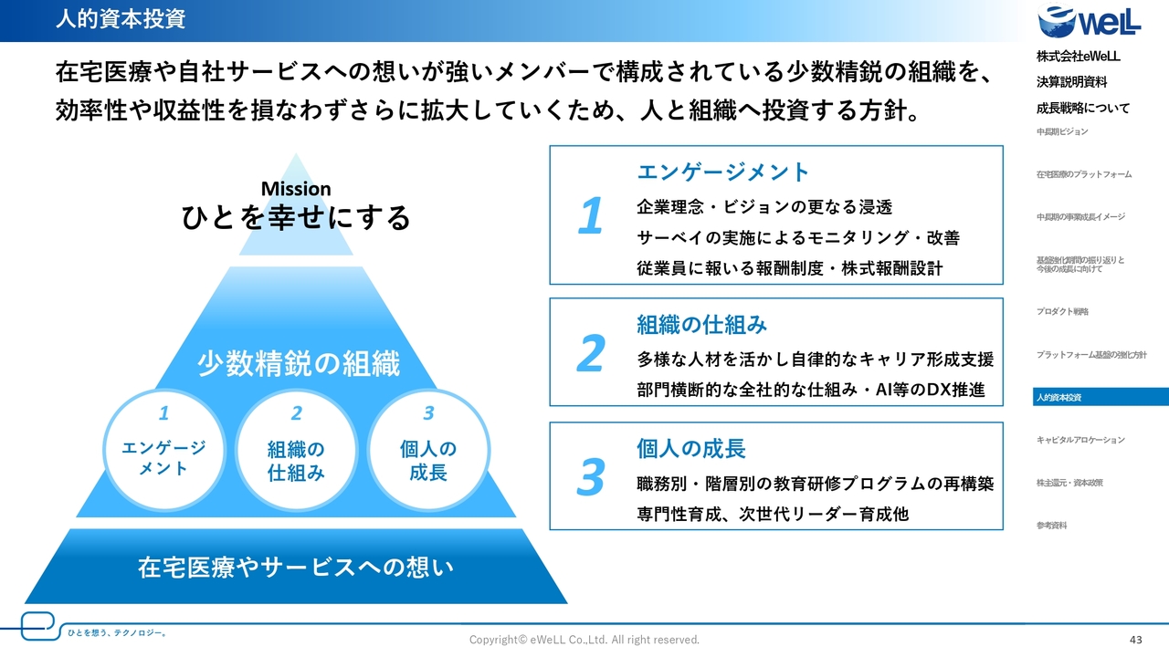 今後も新しいプロダクトの開発やそのアップセルに加え、「けあログっと」など、プラットフォームをさらに浸透させていく必要があるため、その都度、事業の状況を見極め、現状の高い効率性や収益性を損なわずにさらに組織を拡大する計画です。