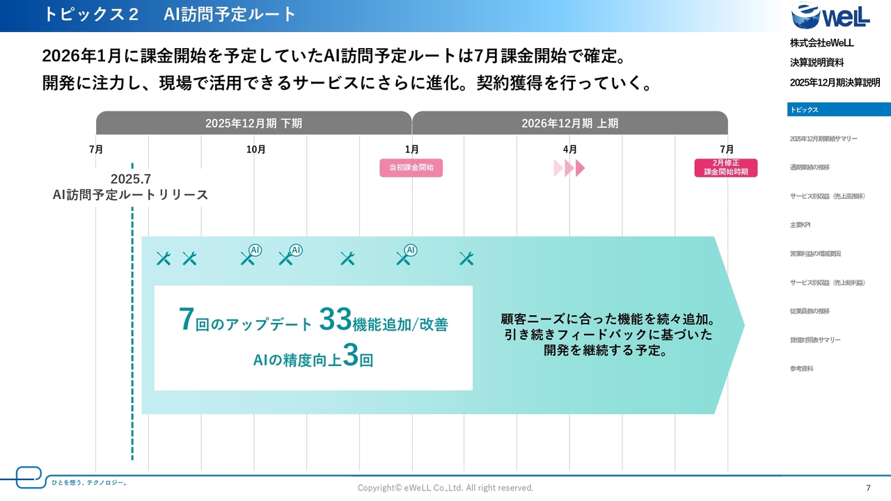 当社の次の成長ドライバーである「AI訪問予定・ルート」の進捗と決定事項についてご説明します。