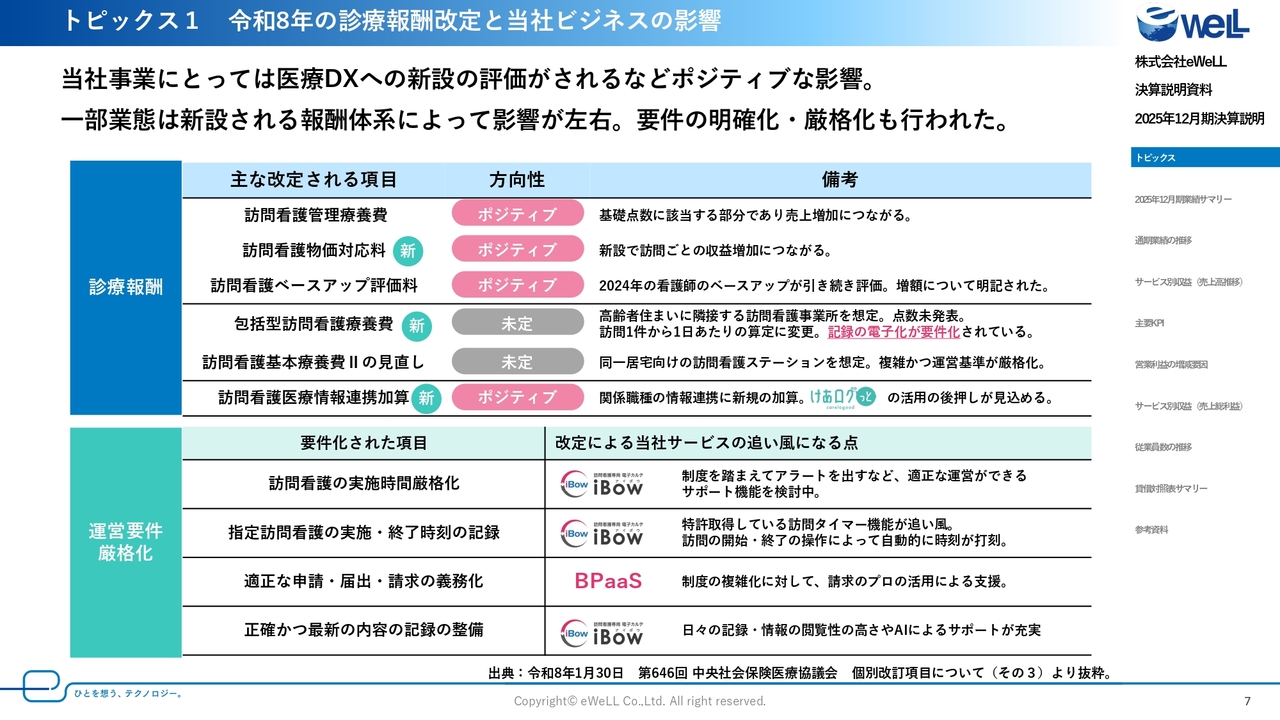 今回、当社の事業に対しての影響が大きいものとして、医療DXに対する加算の新設があります。生産性の改善に向けた改定は今後も続くとみられており、ICT化・DXに対する評価を期待できる改定となりました。