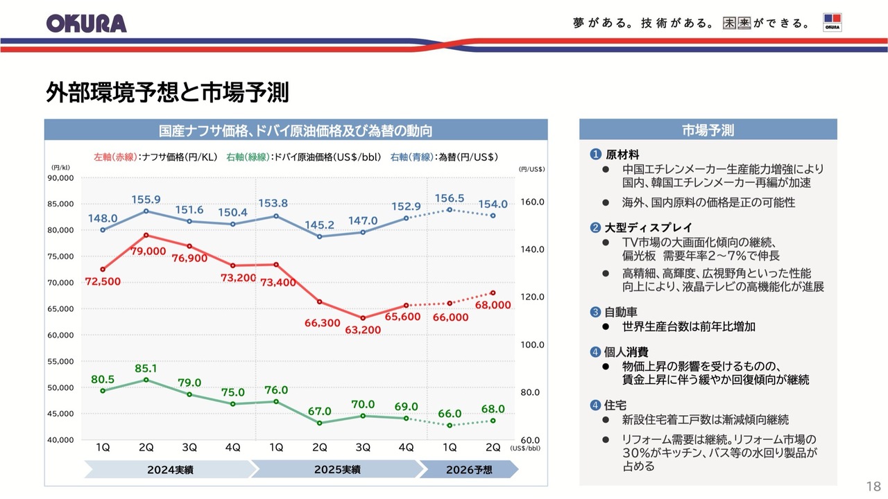 ただし、世界経済の先行きには依然として不透明感が残っており、為替の動向や地政学的リスクの顕在化によっては、ナフサ価格が上昇する可能性も想定しています。