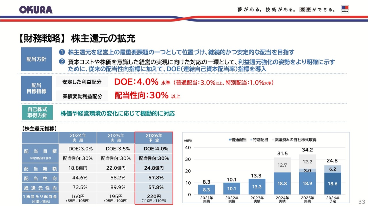 これにより、2026年の1株当たりの配当金は前年比25円増配の年間220円となり、配当総額は24億8,000万円を予定しています。また、自己株式の取得については、株価や経営環境の変化に応じて機動的に対応していきます。