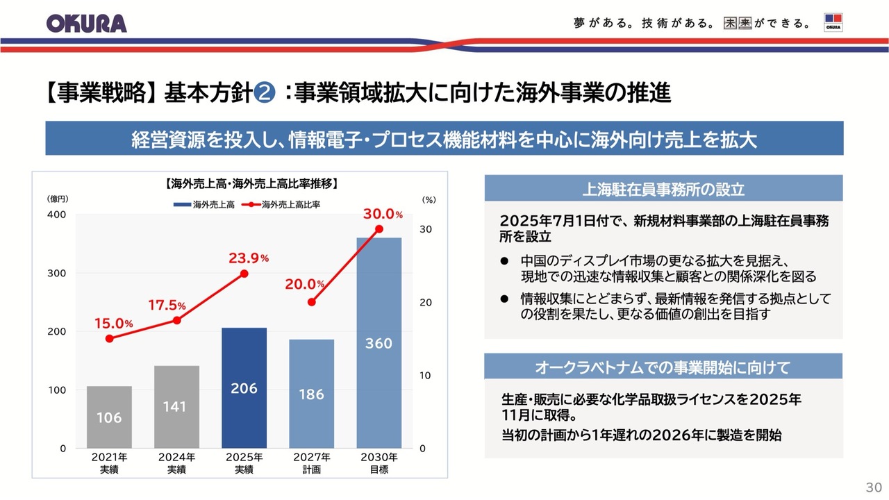 海外展開における重要課題の1つは、光学フィルムの拡大です。上海駐在員事務所を拠点とし、現地での迅速な情報収集と発信、顧客との関係強化に努めていきます。もう1つの重要課題は、オークラベトナムにおける事業推進です。