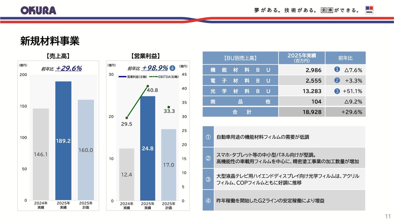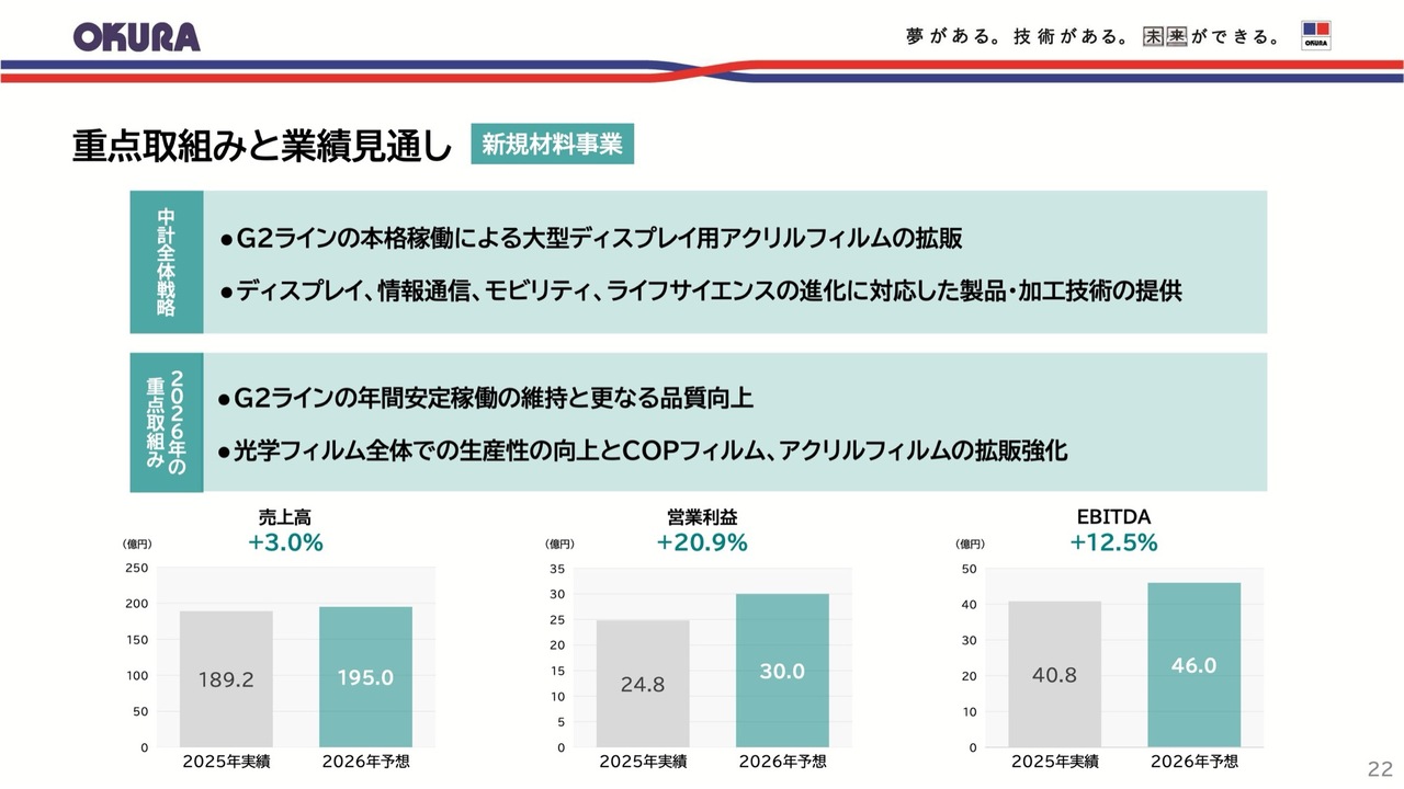 新規材料事業では、売上高は前年比3パーセント増の195億円、営業利益は前年比20.9パーセント増の30億円を見込んでいます。