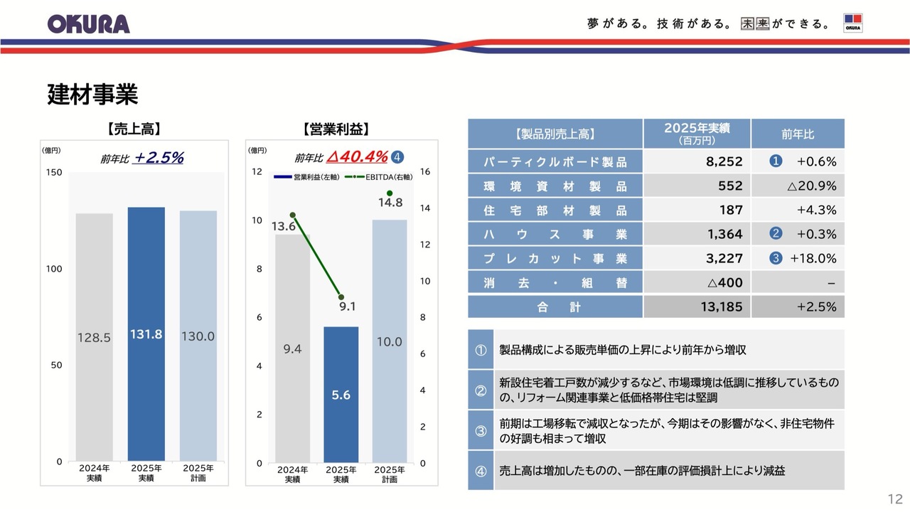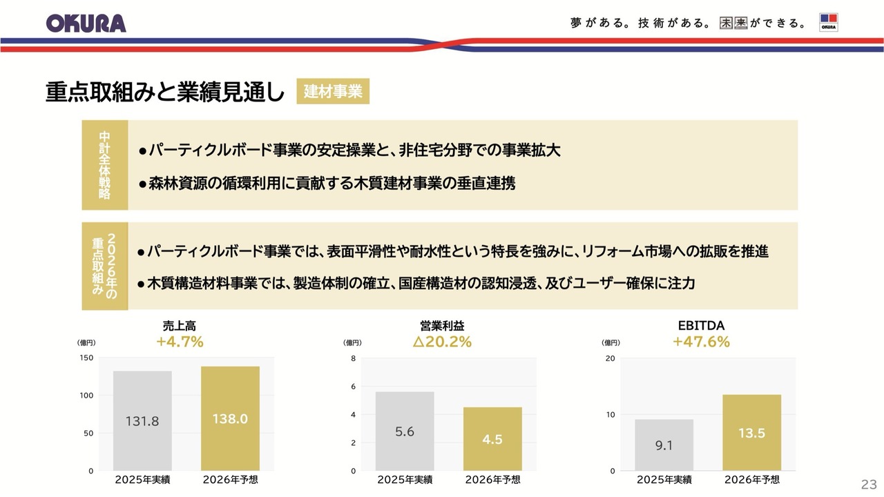 建材事業については、4月から稼働する新工場の稼働に伴い減価償却費が増加するため、減益を見込んでいますが、一方でEBITDAは増加する見込みです。