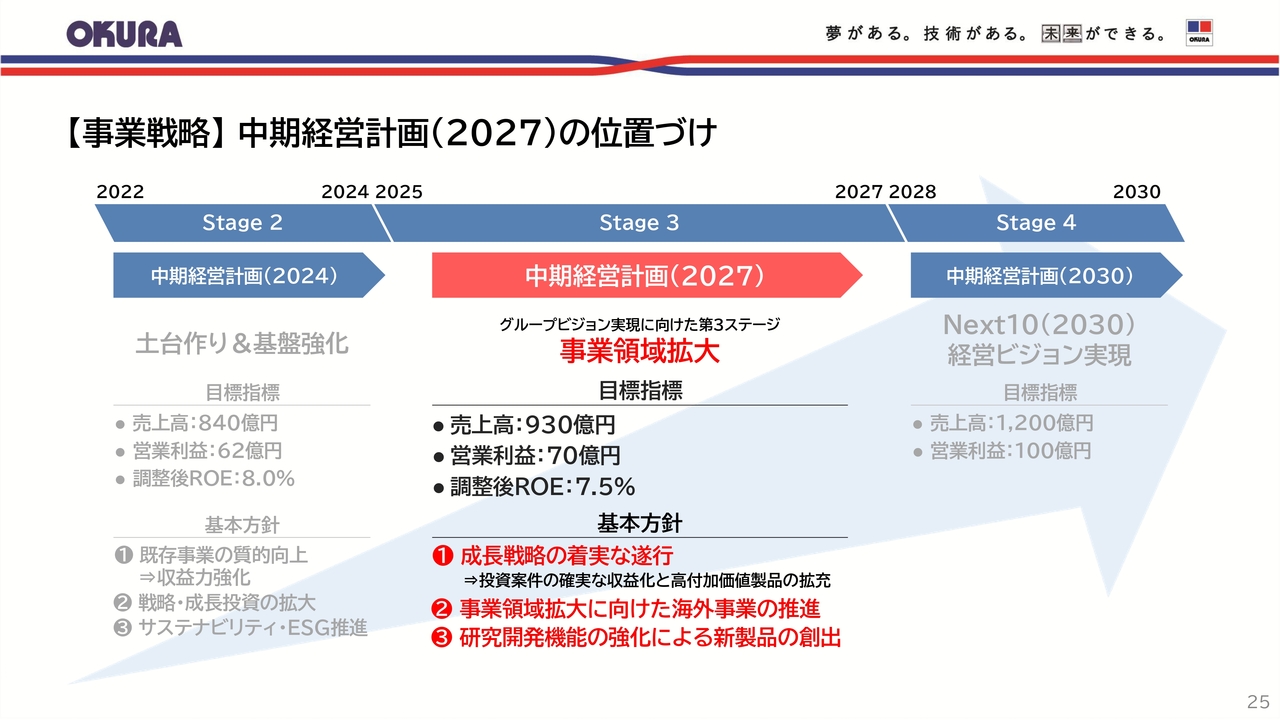 当中計は、前回の中期経営計画で蒔いた種を実績につなげ、事業領域を拡大していくステージと位置づけています。最終年の2027年には、売上高930億円、営業利益70億円、調整後ROE7.5パーセントの達成を目標としています。